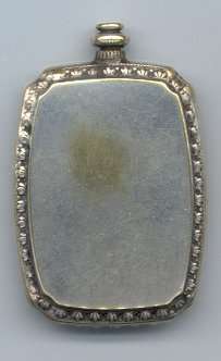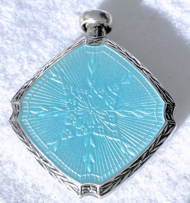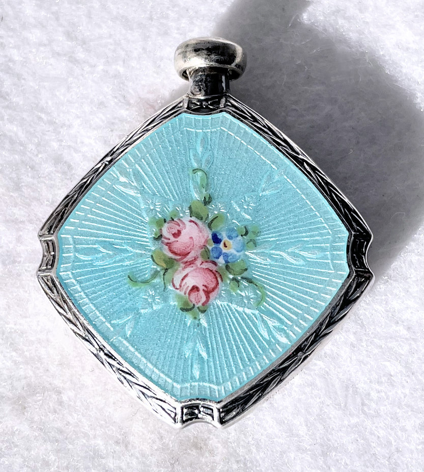 This gorgeous little sterling silver diamond-shaped purse perfume has full baby-blue enamel guilloche on both sides. The front has hand-painted roses in the center and the edges have embosssed designs. Made by Thomae, the little cap unscrews with a dauber attached for the perfume. The designs in the guilloche background are just beautiful and the back looks like a snowflake. Hallmarks are on the bottom right smooth area between the embossed designs. It is in excellent condition. Measures 1-3/16" square not counting the stopper. From top to bottom it measures 1-3/4". (Click on pic for more photos.) |