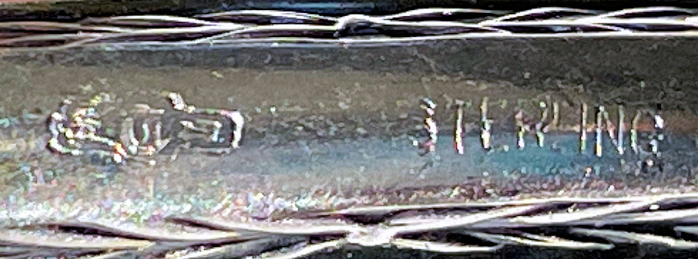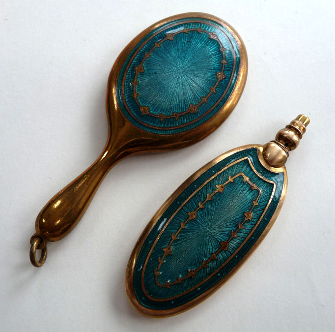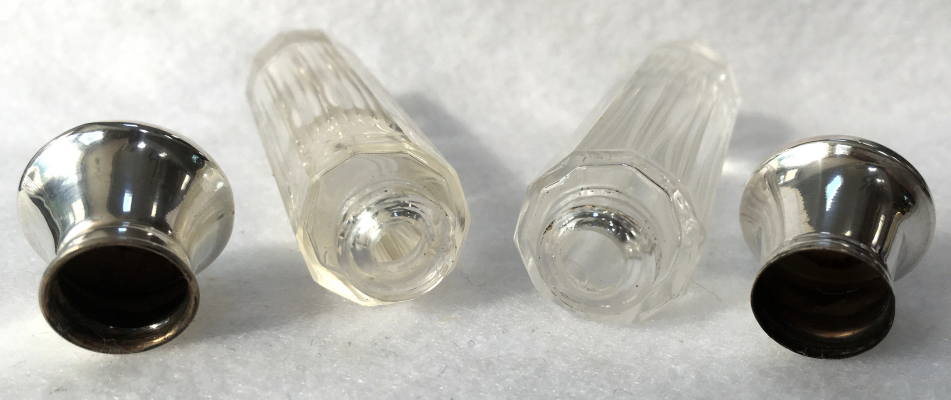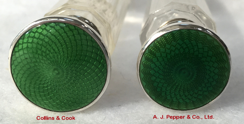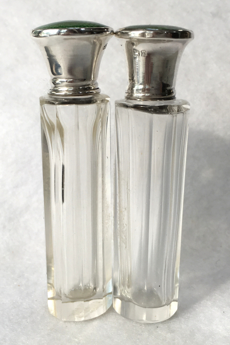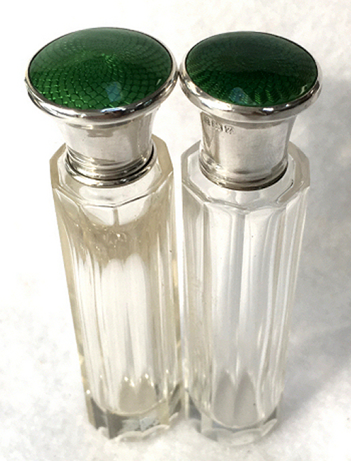Here is a very pretty set of crystal perfume bottles with green enamel guilloche sterling silver tops. Both were made in Birmingham, England, but the tops were made by two different companies even though it is obvious the bases are pretty much identical. I think perhaps the reason for this may have been the design in the guilloche which could have been used to differentiate between perfume and cologne. The bottle on the left in the photo was made by Collins & Cook circa 1920 and it has a smaller well inside. The bottle on the right was made by A. J. Pepper & Co. circa 1920's. This one has a bigger compartment inside. Both bottles screw on tightly but there are no stoppers. If I can find small corks to put inside, I will include them with purchase. The enameling is in mint condition on both bottles. These are a great set and fit perfectly in your purse! The crystal is also excellent with no chips or cracks; both have polished bottoms. The bottles are ever so slightly different in size as well. The one on the left measures 3-1/16" tall x 3/4" diameter. The one on the right measures just a hair smaller in both directions (probably 1/32" difference). (Click on pic for more photos.) |