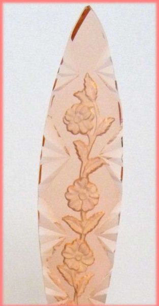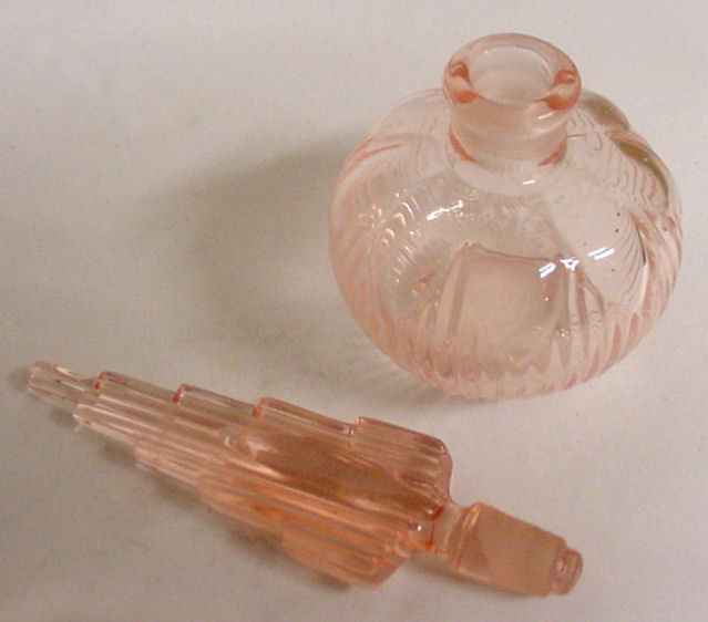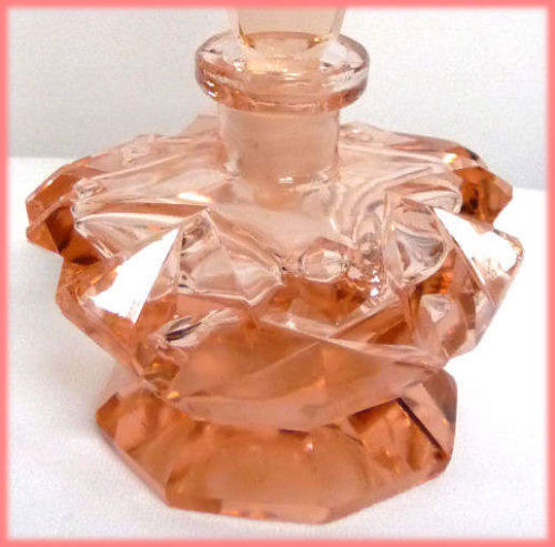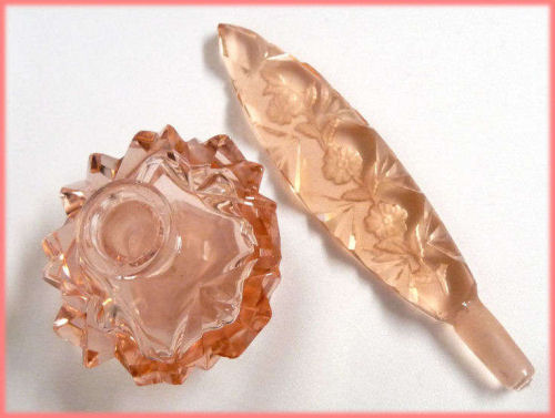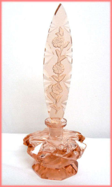 Beautiful pink Czech perfume bottle with feather shaped stopper deeply cut and etched with floral design. Polished bottom on base of perfume -- one tiny chip (visible in super enlarged last photo) and a few teeny chips on inner rim of neck.. Acid etched "Made in Czechoslovakia" barely visible on bottom. Dauber tip is broken off at base of stopper but perfume seals tightly; this is a common finding with vintage perfumes and doesn't really detract from value and certainly not from its beauty! Measures 6-1/2" tall x 2-1/2" wide overall. (Click on pic for more photos.) |