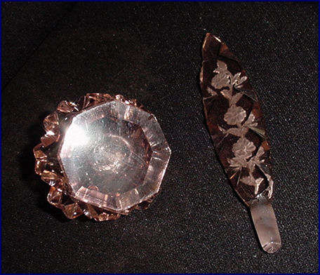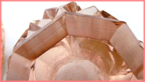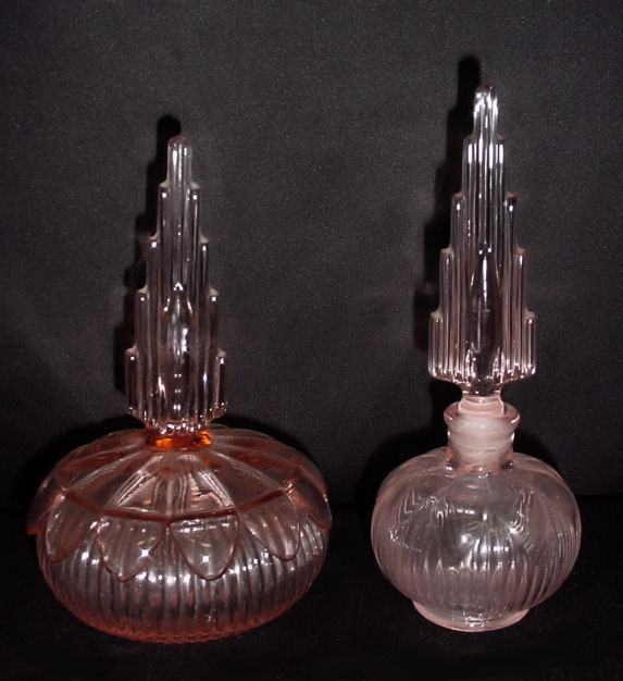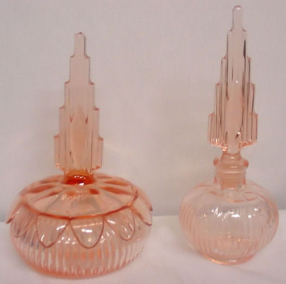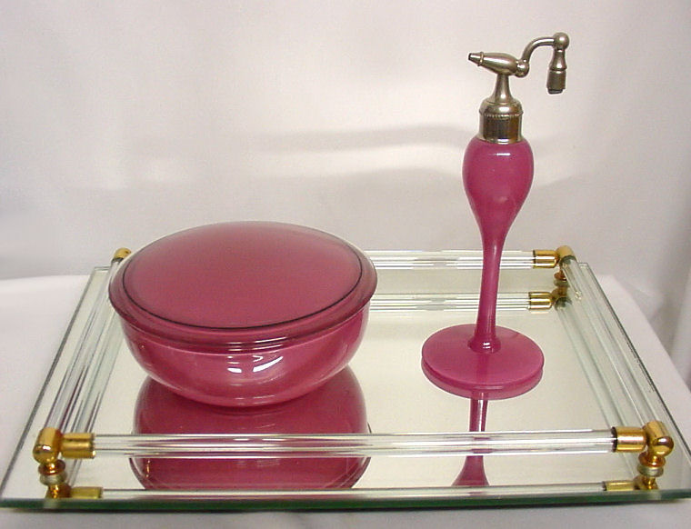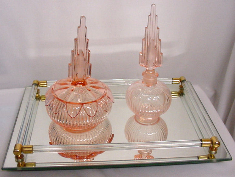 Pink ribbed glass powder box and matching perfume bottle with petal design on lid of powder and side of perfume and stepped deco design tops. Perfume measures almost 6" tall, powder jar is almost 4" diameter and about 4-1/2" high. Uncertain of manufacturer or age. Stopper on bottle does not have a dauber and I am not sure it ever did. It has a slightly uneven tip but it is molded so I don't believe it was ever ground or polished off. Both pieces are in excellent condition. Mirrored vanity tray sold separately. Mirror bottom with glass rods trimmed in brass tips around edge. Measures 8" x 11" O.D., 6" x 9" I.D. (Click on pic for more photos.) |