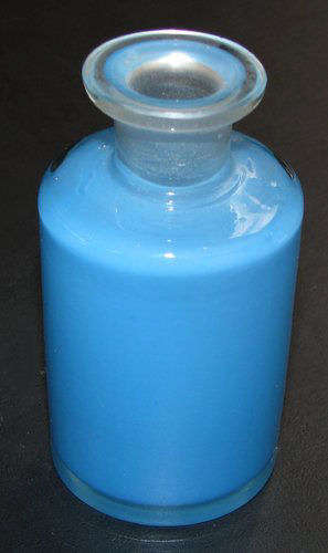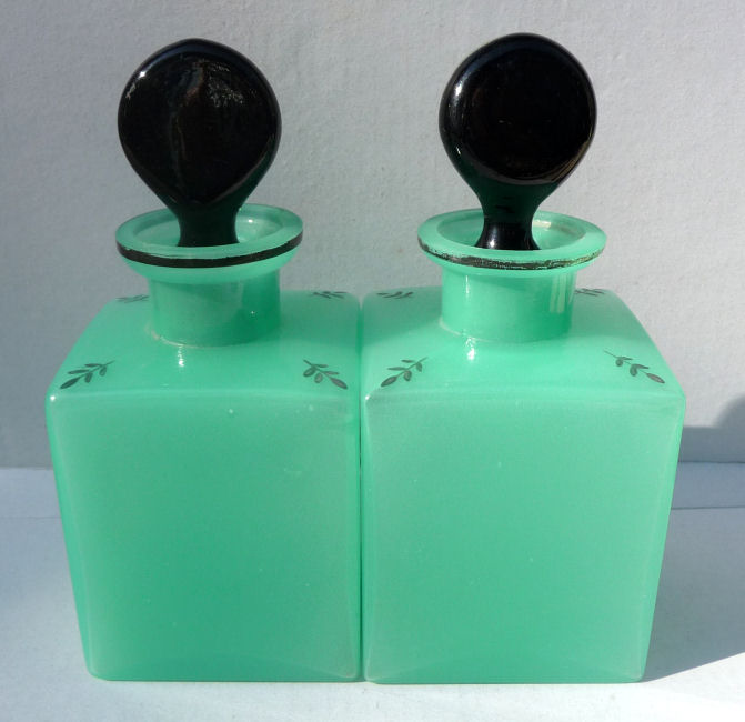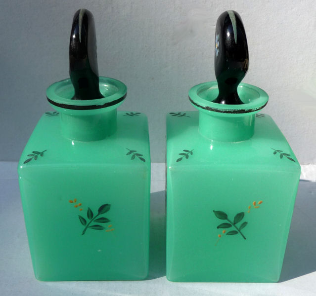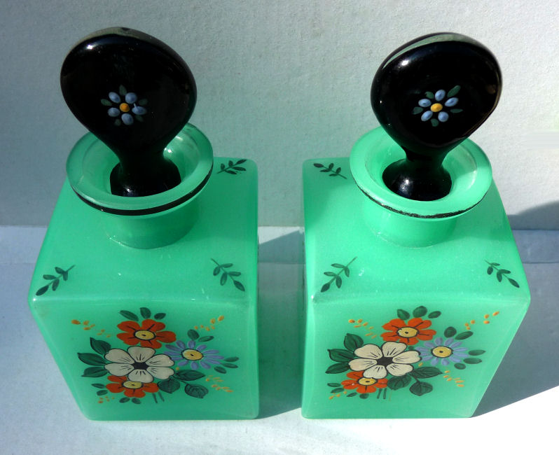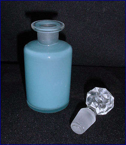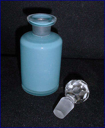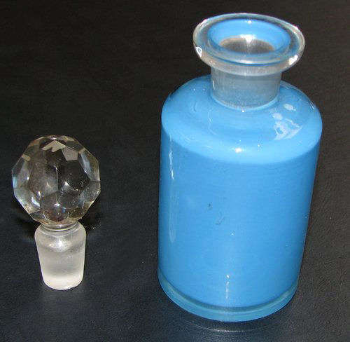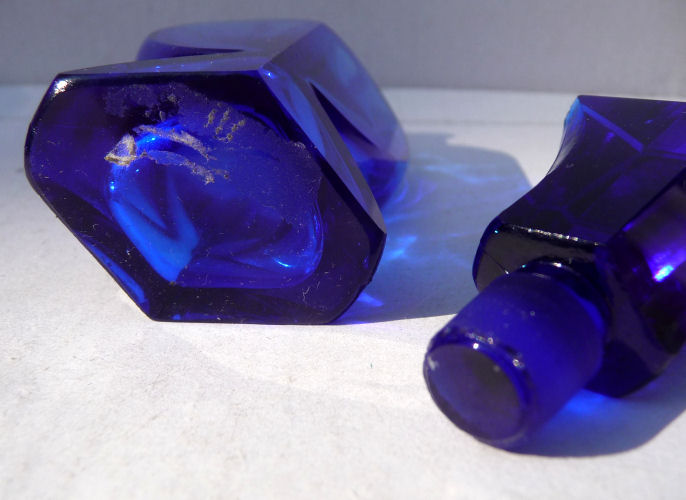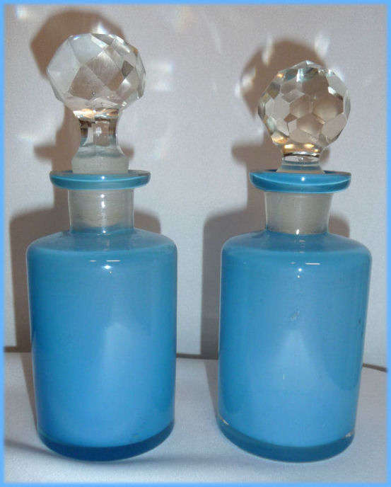 Pair of blue cased opaline perfumes with facet-cut crystal stoppers -- one original, one a replacement. Excellent condition. Bottles measure almost 4" high not counting stoppers and are 2" diameter. Bottoms are polished. (Click on pic for more photos.) |