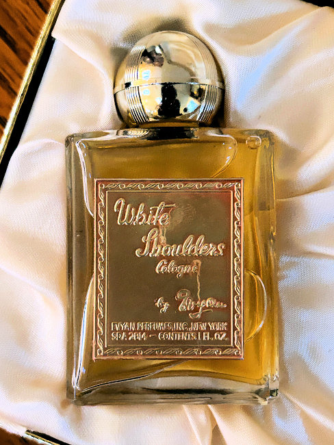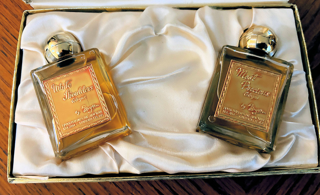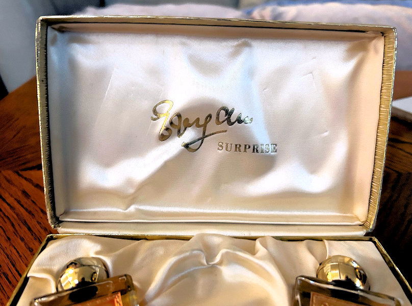 This "Surprise" cologne set by Evyan Perfumes comes in a presentation box with two bottles of cologne inside -- White Shoulders and Most Precious. Each bottle contains 1 fl. oz. Both look to be barely used if at all (evaporation does occur so these may be unused). There would have been a third bottle in the center but that is missing. This would be a great gift for someone or even to enjoy yourself if you collect vintage perfumes and colognes. They both still smell great and the box is in very good condition. The Evyan logo is on the lid as seen in the photos. The box measures 7-1/2" x 4-1/2" x 1-1/2". (Click on pic for more photos.) |