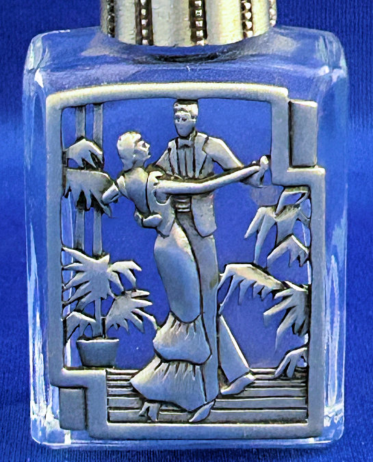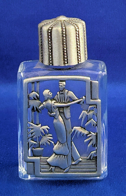 This lovely little perfume bottle is the perfect size to carry in your purse. Made by JJ Jonette, it features a pewter overlay design of an art deco inspired couple waltzing among palm trees and a pewter cap. The bottle is empty but is in excellent condition with no damage whatsoever. It's a sweet little bottle and would display beautifully with colored water inside to accent the figures. Measures 2-1/2" x 1-3/8" x 7/8" overall. (Click on pic for more photos.) |