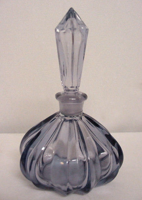 Amethyst glass perfume bottle with ribbed sides, faceted stopper (for some reason picture makes it look more blue than it is). It is a molded piece, no marks. Measures 3" diameter at base x 4-3/4" high. Condition is very good with a few exceptions: there is some roughness around the molded ribs which can be felt rather than seen. And the stopper has a teeny fleabite on one of the points around the top. Again, it is easier to feel than to see. Priced accordingly. (Click on pic for more photos.) |