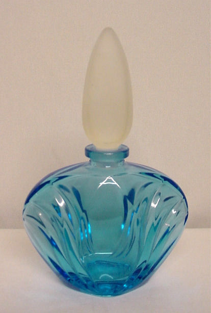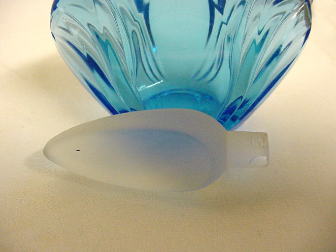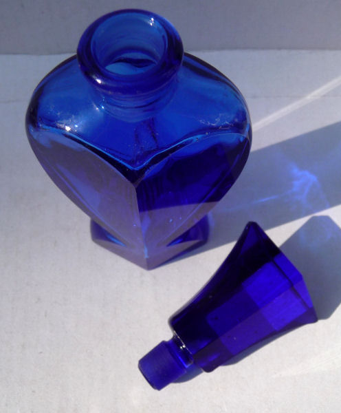 Very pretty Avon perfume bottle in blue glass (more true blue than it looks in the picture). The stopper is white satin glass, bottom is clear blue. A few small chips in bottom of stopper but otherwise perfect. Measures 3" wide x 4-1/2" high overall. (Click on pic for more photos.) |