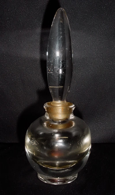 Very plain and simple heavy glass perfume bottle with elongated teardrop stopper. No dauber ... just a ground and polished fitted stopper. Molded glass, no maker's mark. Measures 2-1/4" diameter x 5-3/4" high. (Click on pic for more photos.) |