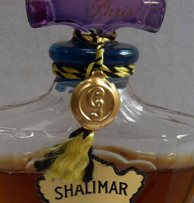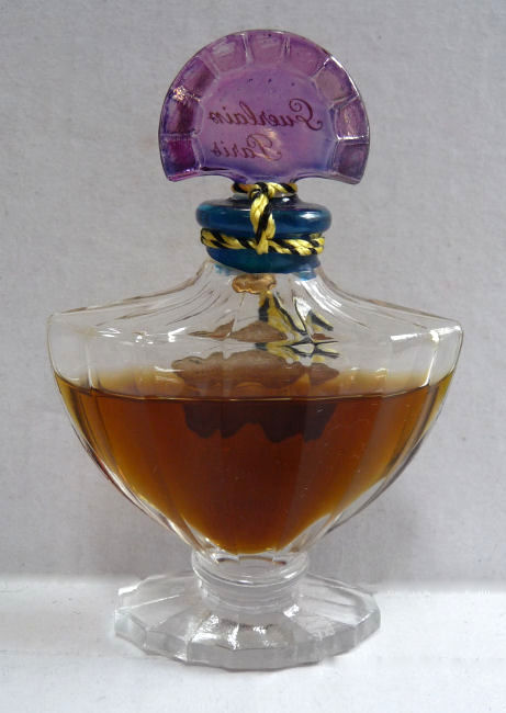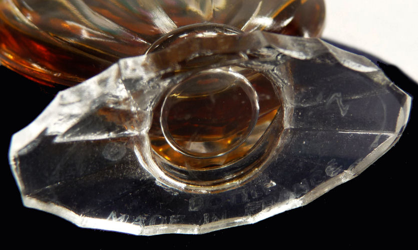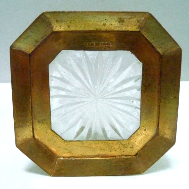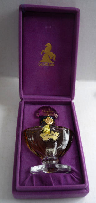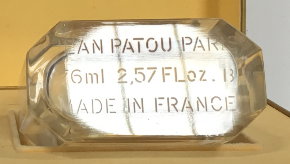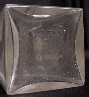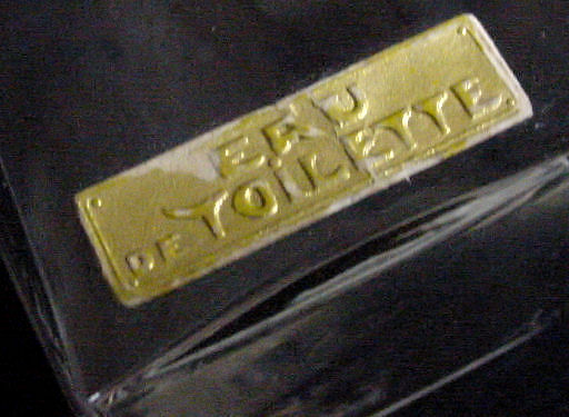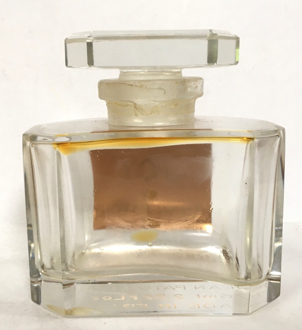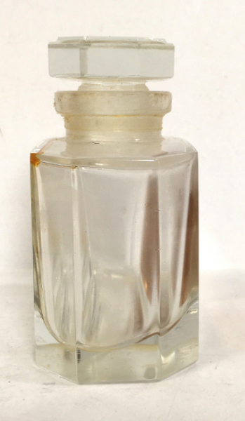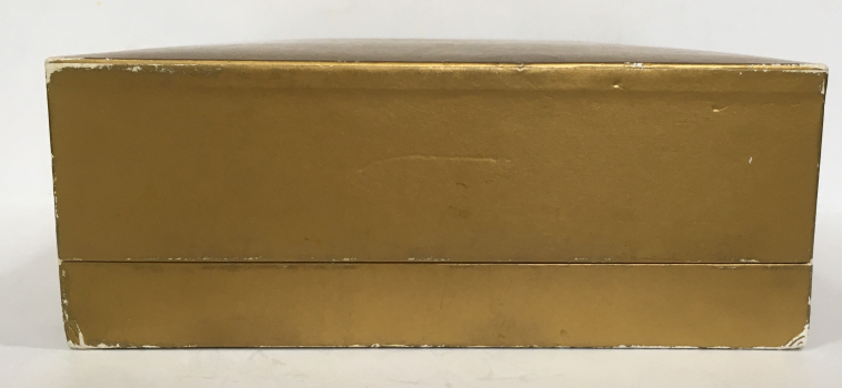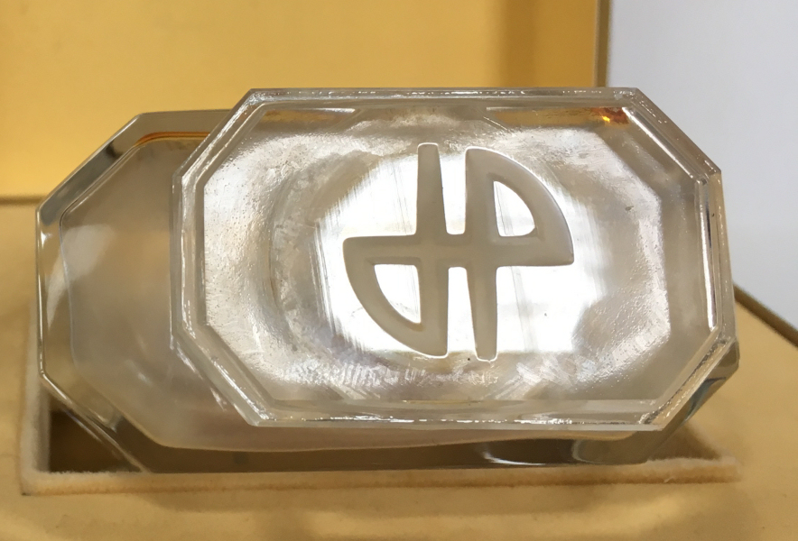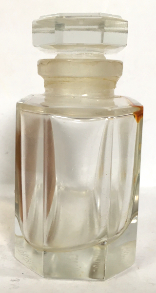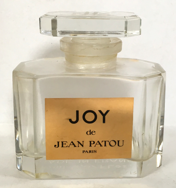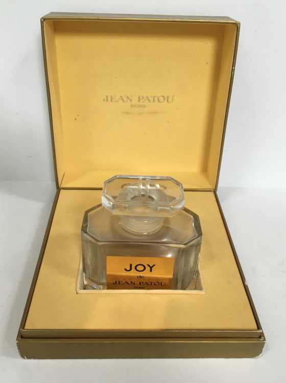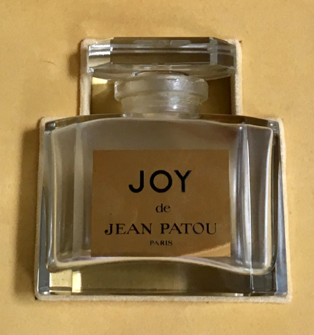 "Joy" perfume was, at one time, the costliest perfume in the world! Created after the Great Depression in Paris, the perfume was said to require over 10,000 jasmine flowers and 28 dozen roses to create one ounce! No wonder it was so expensive! The bottle was done in three designs, this one being done in cut crystal by Baccarat. While the perfume is long gone (traces still linger inside for you to sniff), the bottle itself is in perfect condition and still nestles snugly in its pale yellow velvety lined box. The shiny gold label on the front is also in perfect condition and there is an incised JP on the lid and all other identification marks etched clearly on the bottom. It is a beautiful bottle and a real keepsake. The bottle itself measures 3" across x a bit over 1-1/2" wide x 3" high. The box is approximately 5-1/2" square x 2" high. (Click on pic for more photos.) |