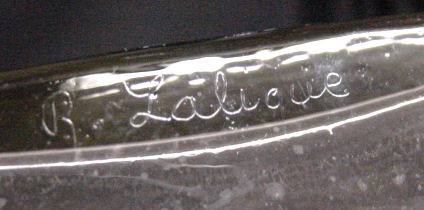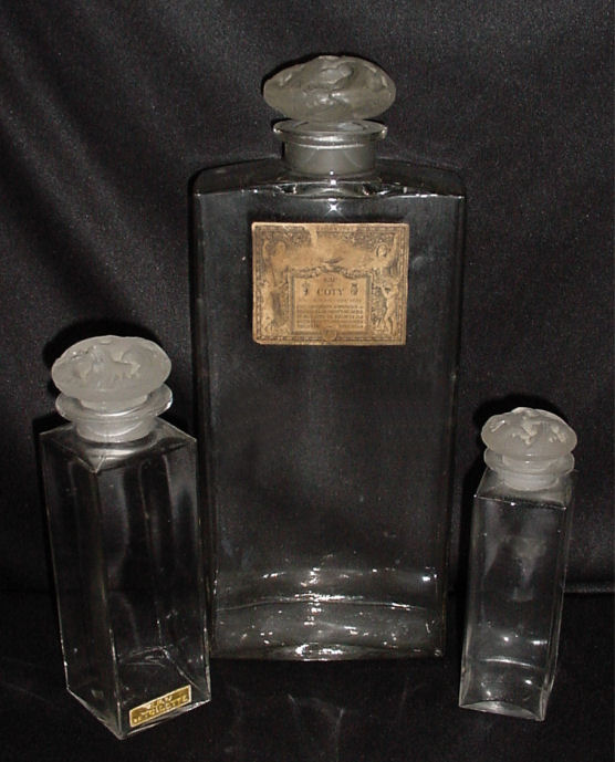 This is a vintage set of three Coty perfume bottles made by Lalique. Original paper label on front of the largest bottle, smaller label on front of mid-size bottle. Two are signed on base. All have the frosted floral caps. Tallest bottle measures 10-1/2" high x 4-1/4" wide x 1-1/7" deep. Mid-size bottle is 6-1/2" high x 1-3/4" square. Small bottle is 5-1/4" high x 1-1/2" square. All in excellent original condition. (Click on pic for more photos.) |