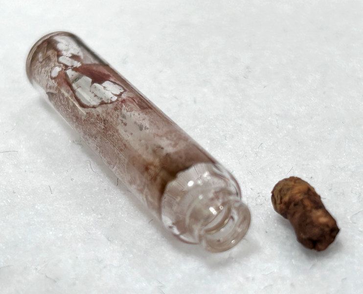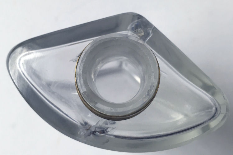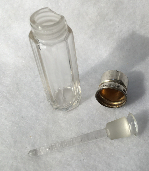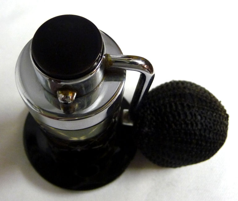 Very odd little purse perfume ... glass perfume has traces of old perfume and long dauber in great shape. Metal carrying case is marked "Made in Germany" and looks very utilitarian with the exception of the embedded jewel in the lid. The cap screws on tightly to hold the perfume inside and keep it sealed tight. Case is a little dented from use but perfume inside is great. Measures a bit over 2-1/2" high. (Click on pic for more photos.) |