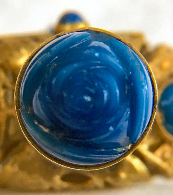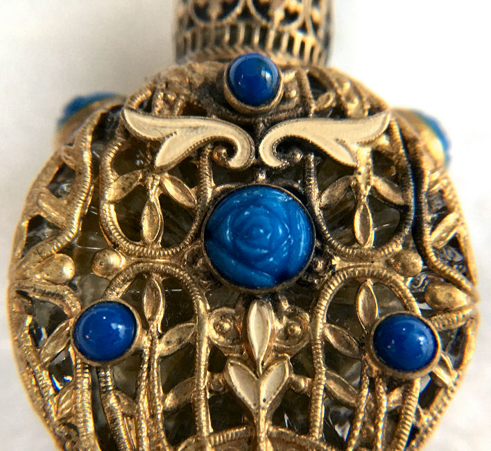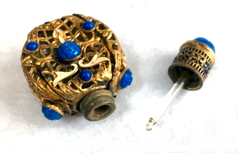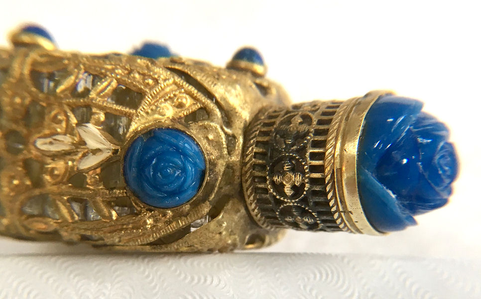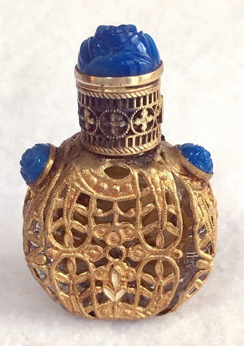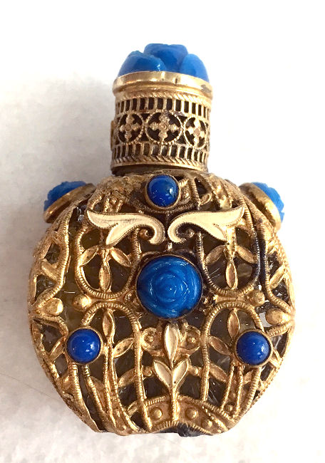 This lovely perfume bottle is completely encased in filigreed brass ormolu with enameled accents and stunning lapis jewels, four of which are carved into roses. It is just stunning! The cap unscrews and still retains its glass dauber in perfect condition. The bottle seals tight and has no damage whatsoever. The enamel accents are on all sides. It is a beautiful piece. Although it is unmarked, if I had to guess, I would say it was from France. Measures 1-1/4" wide x 3/4" deep x 2" high. (Click on pic for more photos.) |