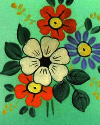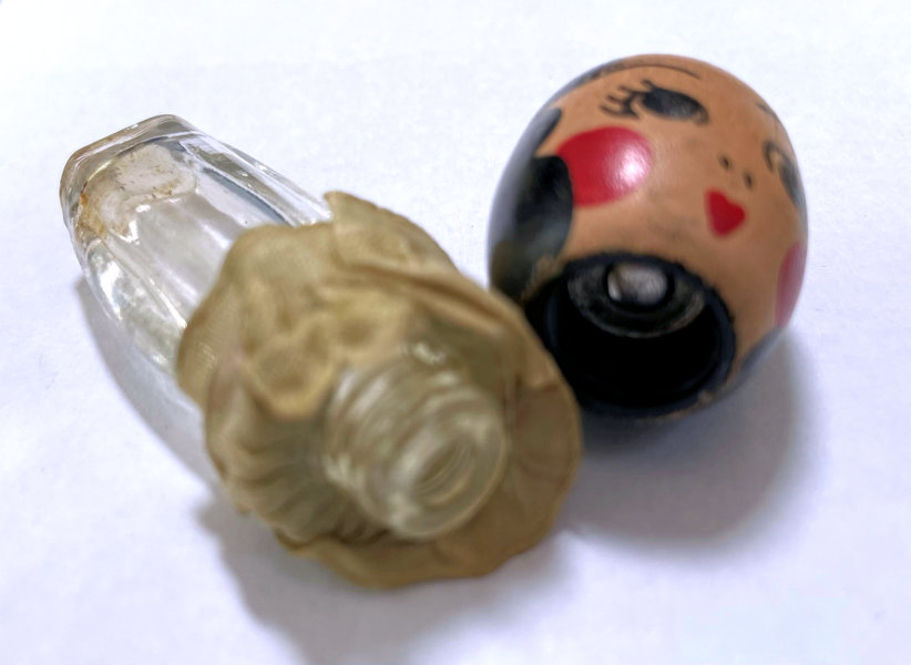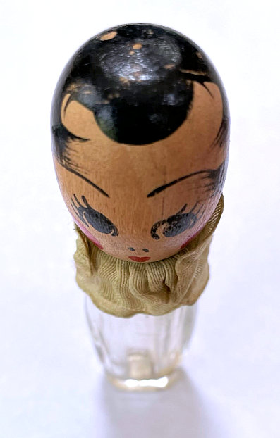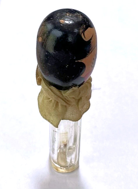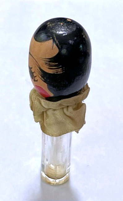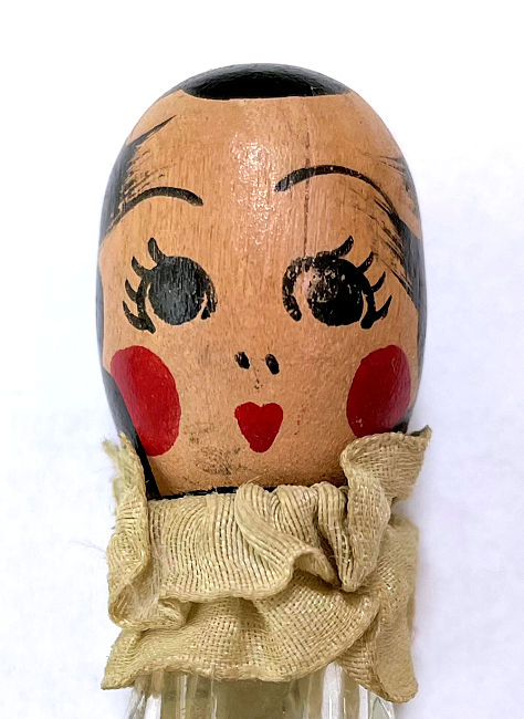 This adorable little glass perfume bottle is topped by a wooden cap with hand-painted features of a rosy-cheeked lass with heart-shaped lips and ruffled collar. Just look at those eyelashes! There is minor wear to the paint, mostly on the back and top; the face is pretty much perfect. Not sure where or who it was made by but there is a mark on the bottom which appears to be an S over a T. If anyone recognizes this, please let me know. Measures 2-3/4" tall. The cap is 1-1/8" tall. Perfect size for your purse. (Click on pic for more photos.) |