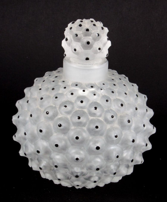 Pretty satin glass bottle with etched ribons and flowers draping down the sides. Cap is stelring silver with lavender enamel guilloche. I thought this was a perfume but the lid unscrews to a wide mouth, so I guess that it held something else?? Excellent condition (Click on pic for more photos.) |
