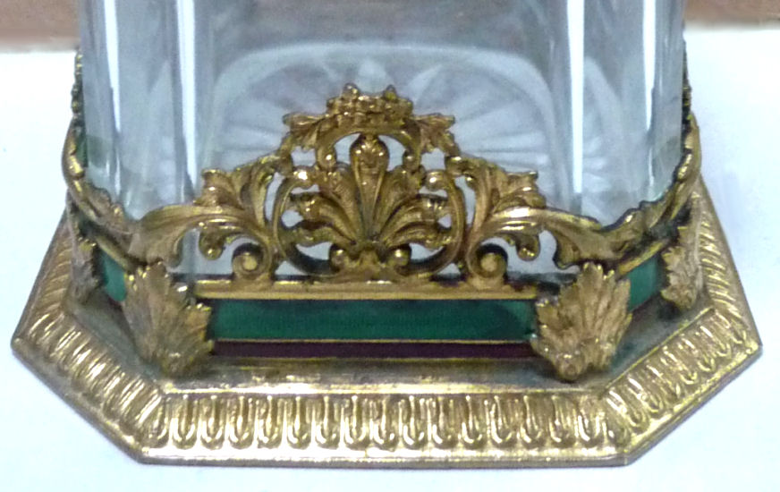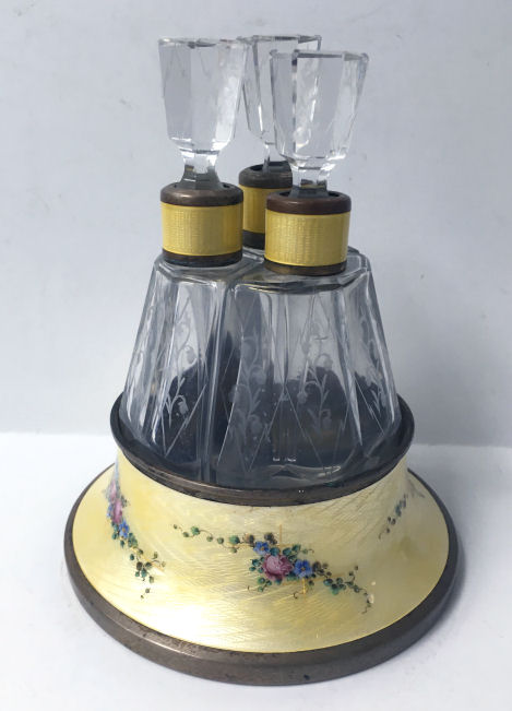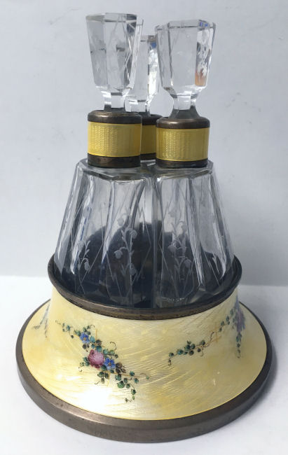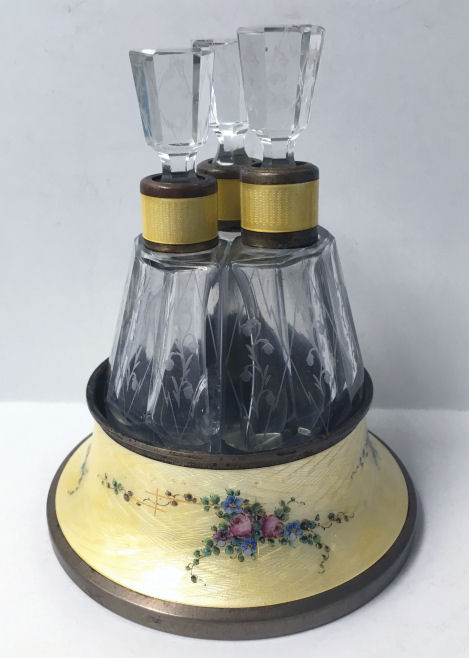 This gorgeous Austrian cut crystal 3-perfume bottle set is carefully shaped and fitted in a beautiful yellow enamel guilloche holder with hand-painted roses on gilt bronze. Each bottle has a yellow enamel guilloche collar on gilt bronze. Signed LENK AUSTRIA on bottom. The stoppers are also cut crystal and have attached daubers (one is broken off). All of the pieces have polished bottoms. Circa 1900 - 1920, it is in pretty good condition for its age. All of the bottlese are water-tight and will hold perfume. Other than the one dauber broken, there is a bit of loss inside the necks (doesn't affect use). Two of the bottles have chips along the edge that I didn't notice until I was feeling them. I will try to include a photo to show it. All in all, the set is very beautiful and the flaws really don't show at all unless you know where to look. Similar sets like this have sold for upwards of $400 ... I am pricing mine accordingly to the imperfections. Enameling is is very good condition with no obvious chips or dings. Measures almost 5" diameter at the base of the caddy. The bottles are 2-5/8" wide x 4-1/4" high not counting stoppers. One stopper is taller than the other two (perhaps to denote perfume as opposed to cologne?). Overall heights are 5-3/8" and 5-5/8". Height of caddy with perfumes inside is almost 6-1/2". (Click on pic for more photos.) |