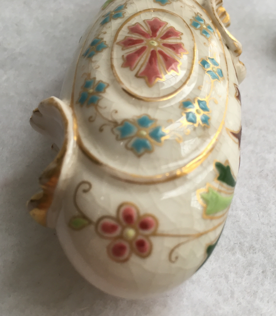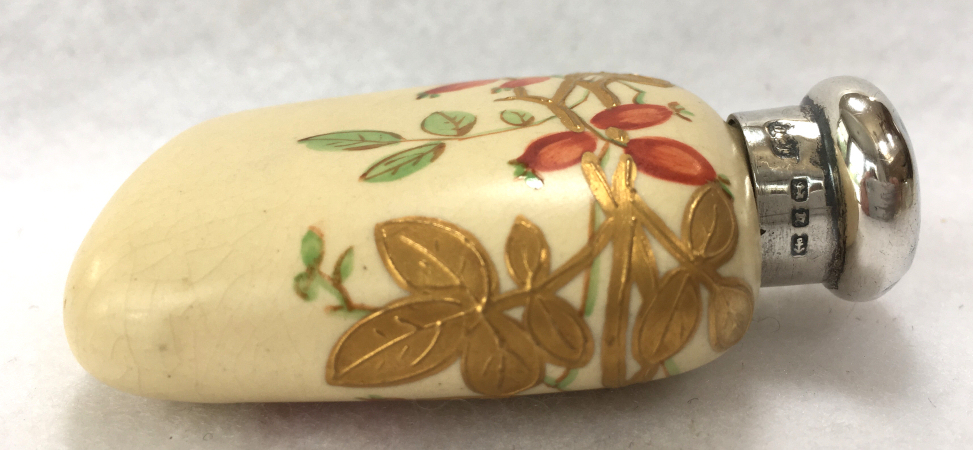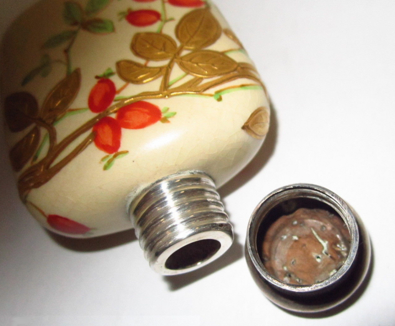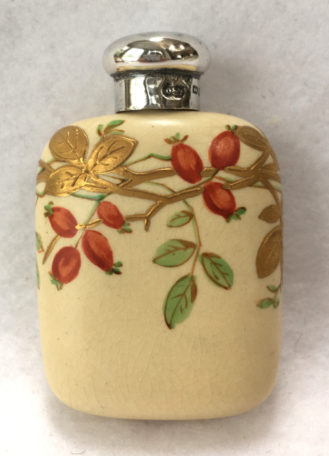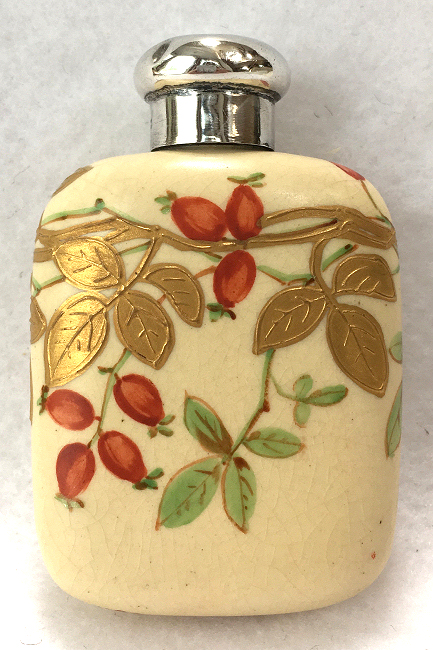 This charming little scent bottle dates from 1888 (British registry number is stamped right on the bottom which dates it to that year, so it is 130 years old!!!) The age of this piece and the fact that it has survived intact is remarkable indeed! Obviously it was a treasured heirloom all those years. The bottle is hand-painted completely around all sides and fits comfortably in the palm of your hand. It is topped with a sterling silver screw-on cap which bears Birmingham hallmarks dating from 1912. More than likely the bottle was made and was not actually manufactured into a perfume bottle until the company making the tops actually produced it. But both pieces are obviously original to the piece. All of the paint and gilt is in perfect condition. The bottle itself has very faint crazing which one would expect in a piece this old, but it is totally usable should one wish to do that (I would never ... the piece is too valuable to me to risk breaking it but that is my opinion). The gold gilt actually has raised veins in the leaves which can be seen as well as felt. This is a truly stunning piece that deserves a prominent spot in any perfume bottle collection. Measures a tad over 2-1/2" high x 1-5/8" wide x 3/4" deep at top side (tapers narrower at bottom ... see pics). (Click on pic for more photos.) |