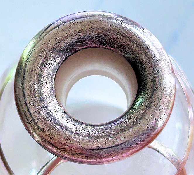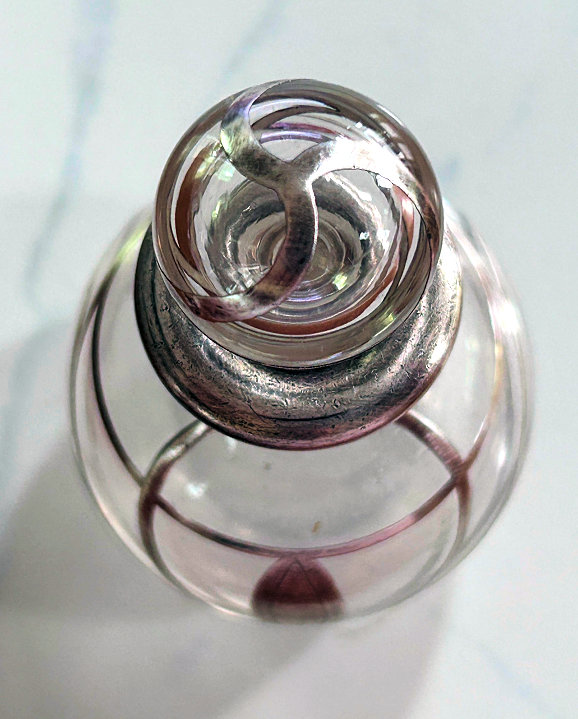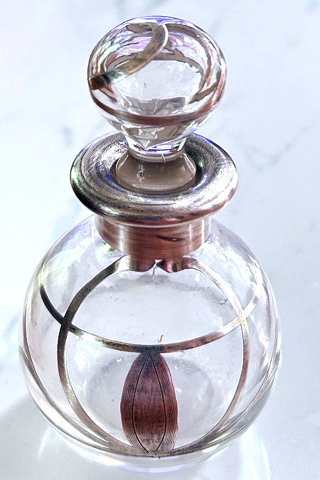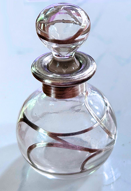 This lovely little perfume bottle is simplistic in design but high on elegance. It has a sterling silver overlay of entwining swirls all coming from a central oval. The stopper also has matching sterling overlay designs. There are no chips or cracks to the bottle itself; however, the stopper has a tiny chip on the bottom. The bottle does have some clouding as is commonly seen. There is no maker's mark but It is marked "Sterling" on one of the silver strips. Measures approx. 3-1/2" high from top to bottom and about 2" diameter. (Click on pic for more photos.) |