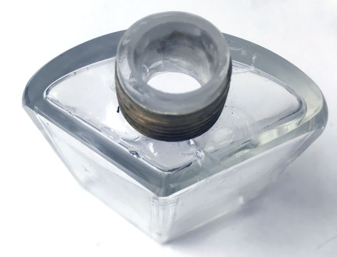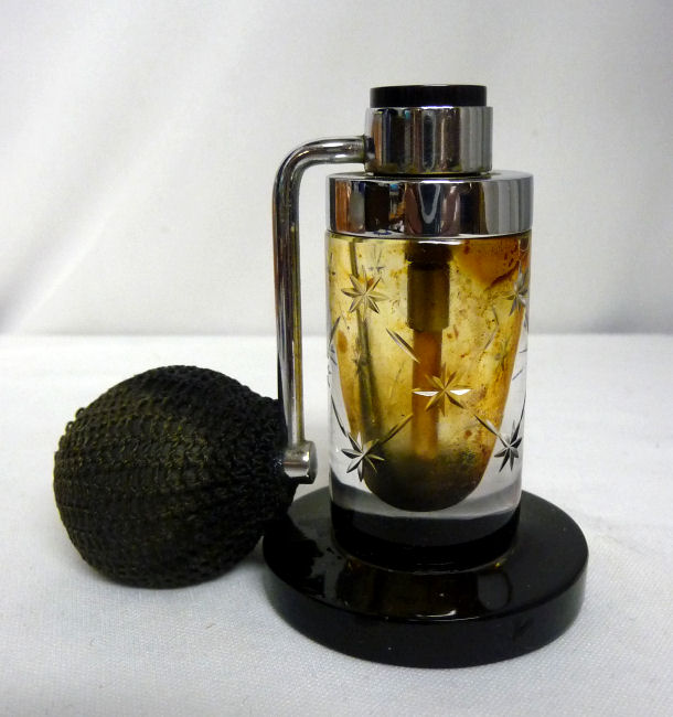 This is a pretty little art deco stylized perfume atomizer marked on Made in U.S.A. on the bottom. Atomizer is hardened and deterioriating but the glass portion is in excellent condition as is the uptake tube inside. Measures 1-7/8" x 1" x 2-1/4" high (does not count bulb). (Click on pic for more photos.) |