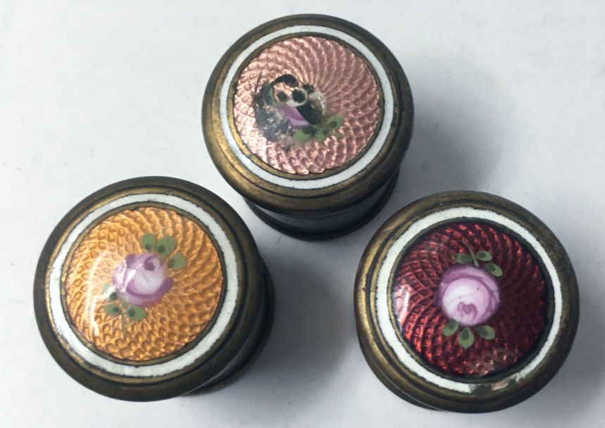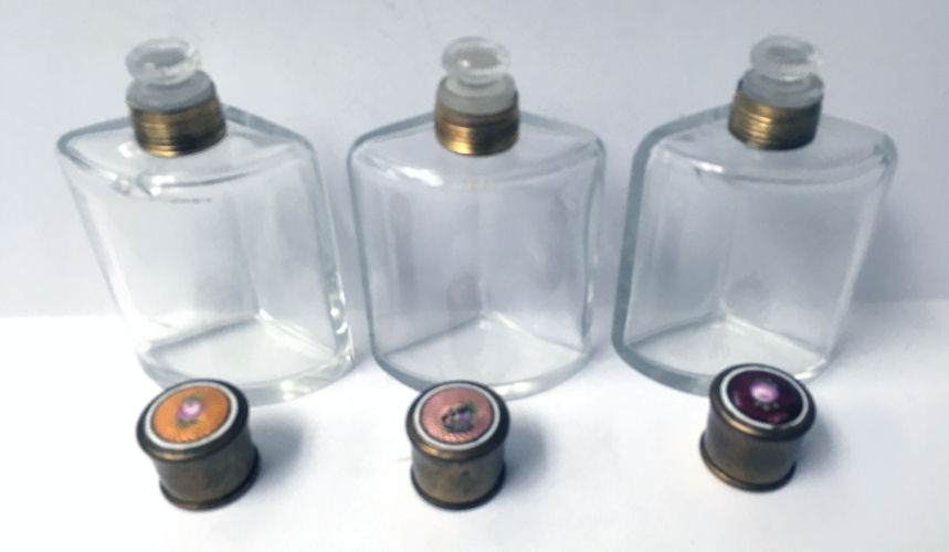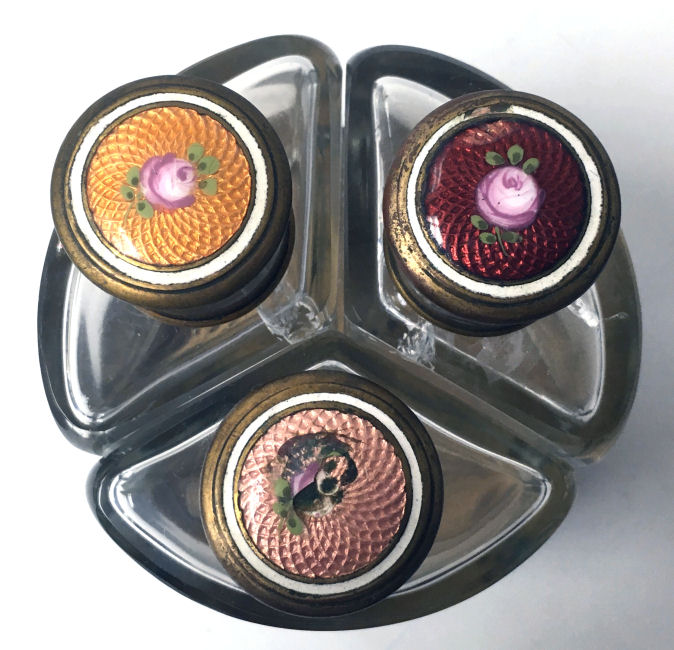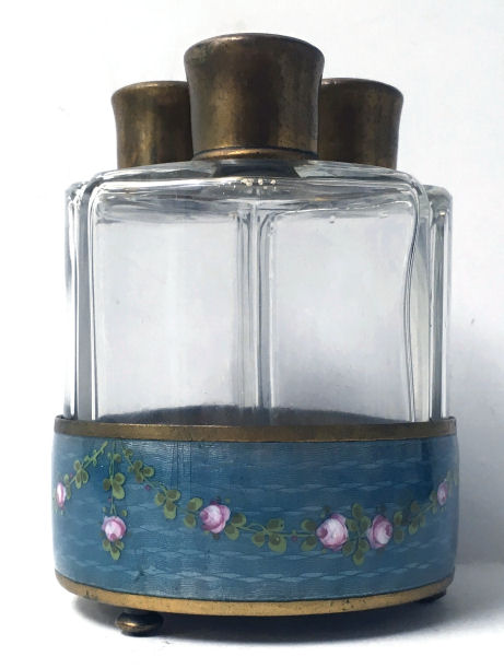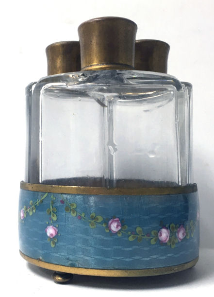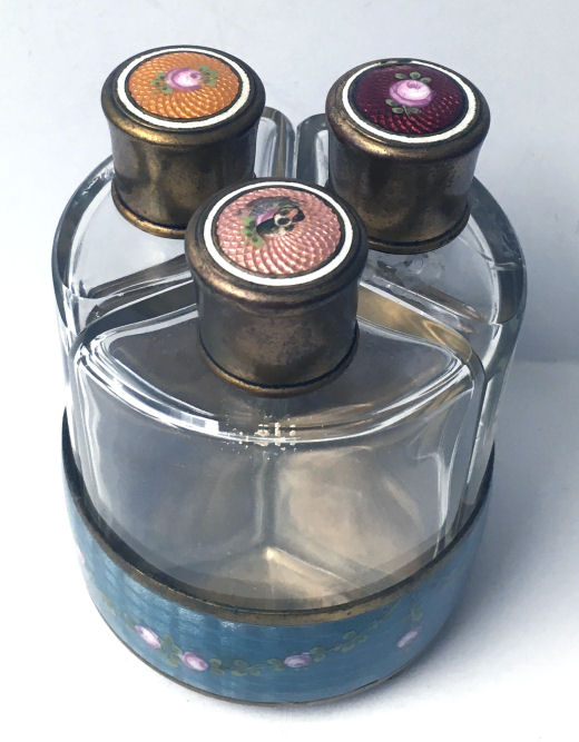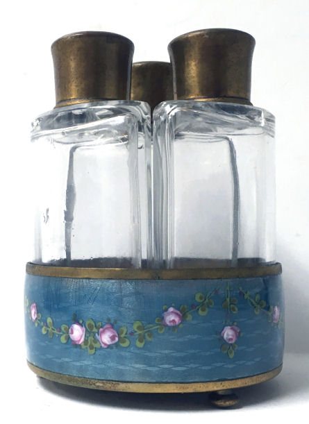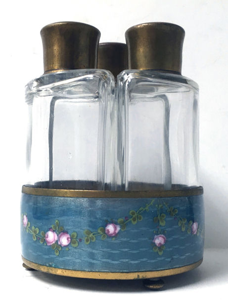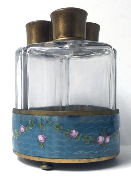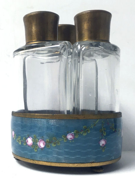 This is another of the perfume caddies I am offering. Featuring three rounded perfume bottles that fit snugly into a bronze base finished in blue enamel guilloche with hand-painted roses all around and three little bun feet. Each perfume bottle is topped with a screw cap and have glass stoppers inside. The lids each have a different color of enamel guilloche with hand-painted flowers. All of the bottoms are polished and have acid marked "Made in Czecholoslovakia". There is a spot of missing enamel on the red lid and a chip to the enamel on the pink lid; but other than that, all of the enamel is in great shape. Two of the bottles have fractures inside the thick glass ... I have tested each of these and they are completely water tight and do not leak at all so they are totally usable. Priced according to condition. The base measures almost 3-1/2" diameter x 1-5/8" higih. The perfume bottles are 2-3/4" wide x 4-1/4" high. Overall the set is 4-3/4" high. (Click on pic for more photos.) |