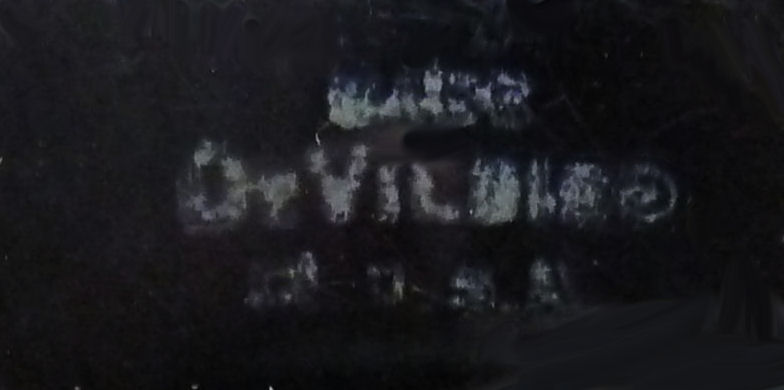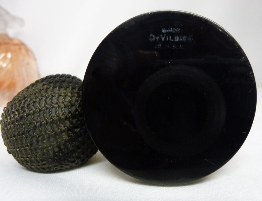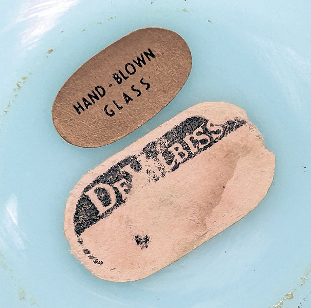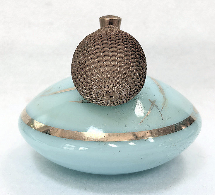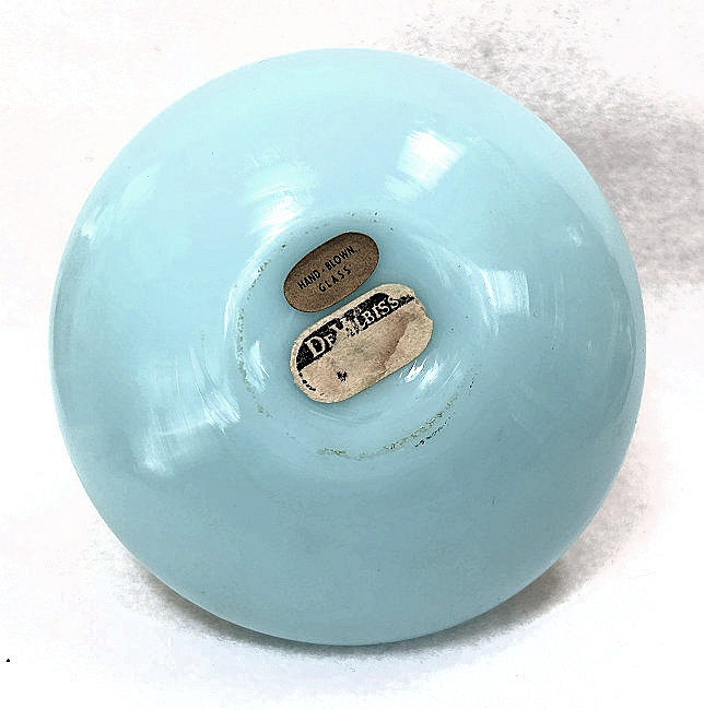 This very pretty perfume atomizer was made by DeVilbiss, probably in the late 40's or early 50's. It is hand-blown glass and the color is a very pretty delphinium opaline blue with gold gilt swirl designs painted onthe surface. The atomizer bulb is stiff and hard (typical of this age) and there is some very minor wear to the gold as I have tried to show from all sides in the photos. It is mostly intact, though, and displays wonderfully. There are two labels on the bottom, one that says "Hand Blown Glass" and the other is the original DeVilbiss sticker which does have some wear. There are no cracks or damage to the glass of any kind. Measures approx. 4" diameter and 3-1/4" high. (Click on pic for more photos.) |