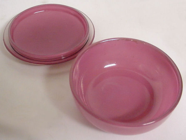 Pink (almost like peachblow) DeVilbiss signed perfume and matching powder box. Atomizer ball is missing from perfume. Signed on silver top of perfume and acid etched on bottom of powder box. Powder box has black accent line around lid. Perfume measures 6" tall, powder jar is 4-3/4" diameter. Both pieces are in excellent condition. Mirrored vanity tray sold separately. Mirror bottom with glass rods trimmed in brass tips around edge. Measures 8" x 11" O.D., 6" x 9" I.D. (Click on pic for more photos.) |