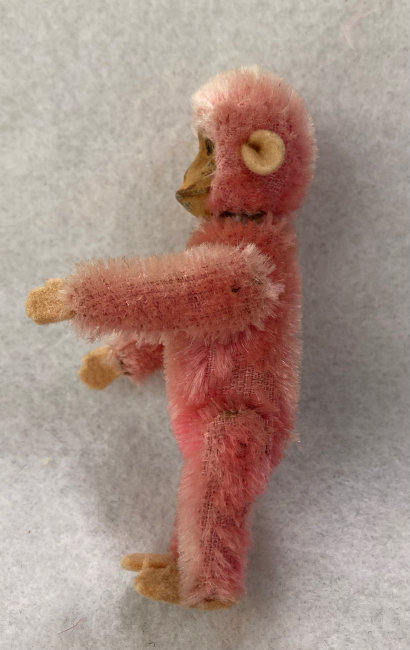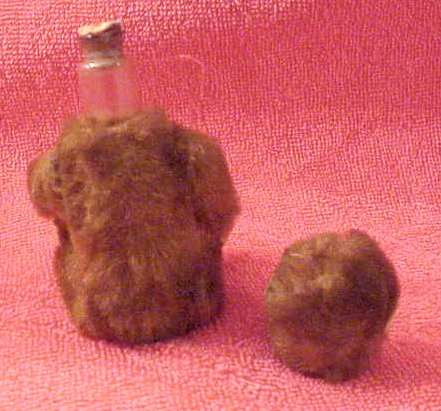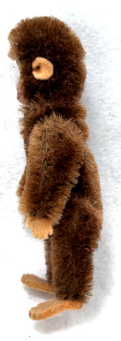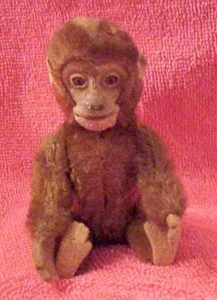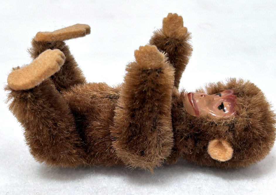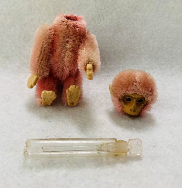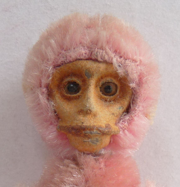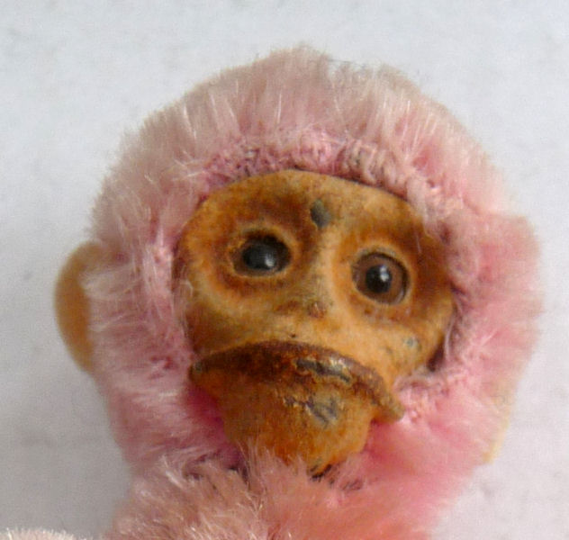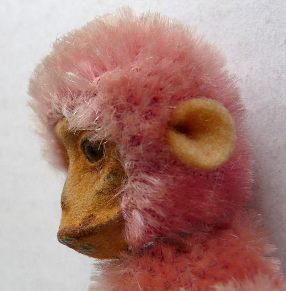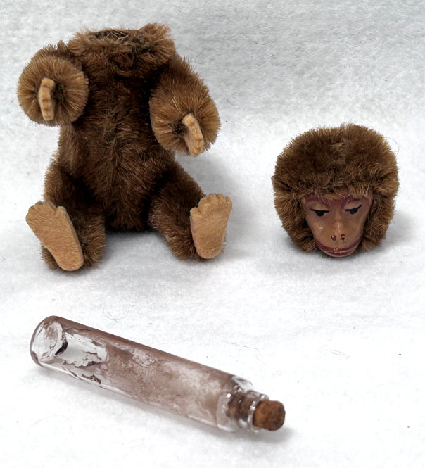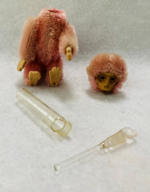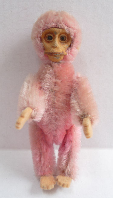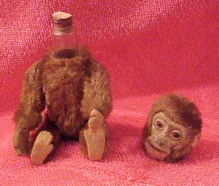 This adorable little mohair monkey was made by Schuco around 1929. The feet, ears and hands are shaped felt and the face is metal with light flocking on it (some age appropriate wear). The head lifts off to expose a hidden glass perfume bottle with original cork stopper. The bottle itself has traces of old perfume still inside and the entire bottle can be removed from the body. Normally the mohair on these shows quite a bit of moth damage but this one is near perfect! Felts are all in great shape as well. Measures 5" tall. Previously listed for $625 ... now below my cost! (Click on pic for more photos.) |