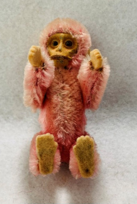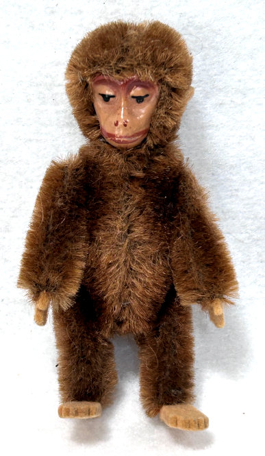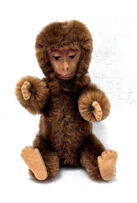 This adorable little mohair monkey was made by Schuco around 1929. The feet, ears and hands are shaped felt and the face is metal with hand-painted features -- very rare and hard to find! The mohair on this one is all in mint condition with is also very hard to find ... these are a culinary delight to moths and many over the years have extreme loss to the hair. This one is like the day it came from the factory. He is fully jointed and can be posed. The head lifts off to expose a hidden glass perfume bottle with and old cork stopper still inside. The entire bottle can be removed from the body. He has little felt ears, feet and hands which are also in like-new condition with no wear whatsoever. Great for display or even to use. Measures 3-1/2" tall. First time offered! It has been in my personal collection since 1999! (Click on pic for more photos.) |