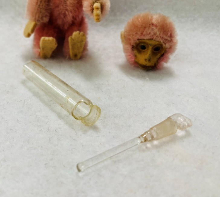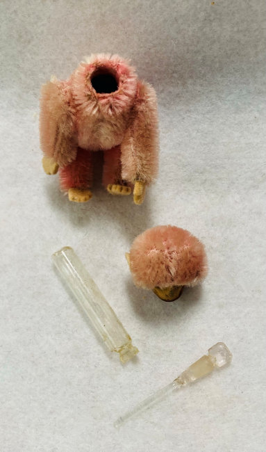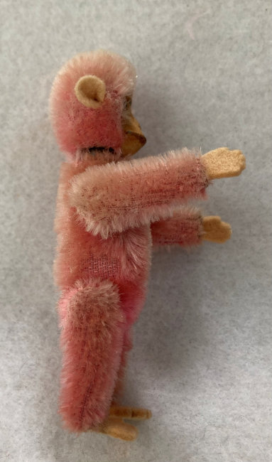 This adorable little mohair monkey was made by Schuco around 1929. The feet, ears and hands are shaped felt and the face is metal with light flocking on it (some age appropriate wear). The head lifts off to expose a hidden glass perfume bottle with original glass stopper with dauber intact. However, the neck of the bottle has a chip broken out of it that goes deep enough into the bottle that it will not hold liquid securely (although I can't imagine anyone wanting to do that!). The entire bottle can be removed from the body. Normally the mohair on these shows quite a bit of moth damage but this one is in pretty good condition with minimal loss ... just a section on his back that is visible in the photos. Face has minimal wear also as shown in photos. The felt ears, feet and hands are all in great shape. Measures 3-1/2" tall. First time offered! It has been in my personal collection since 1999! (Click on pic for more photos.) |