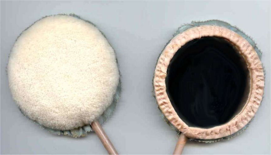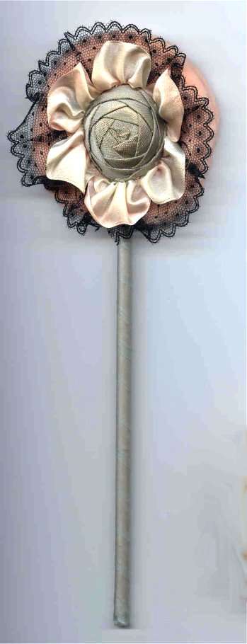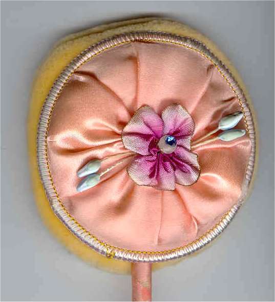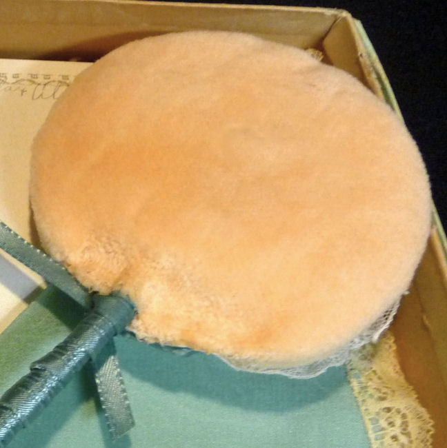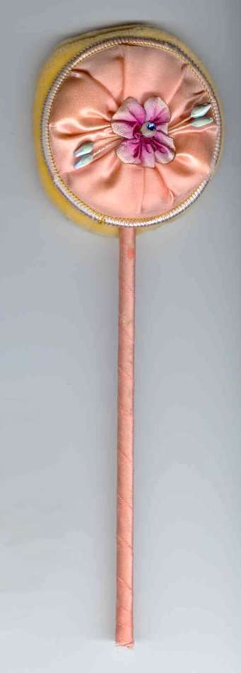 This pretty powder patter is all original done in peach with a lovely silk flower with jeweled center. Ribbon-wrapped wand in excellent condition as is the powder puff on the back side. Appears to have never been used. (Click on pic for more photos.) |