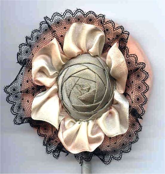 Sexy roaring 20's black lace powder patter with silk rose design in center and original ribbon-wrapped wand. Excellent condition overall with no visible wear. Gorgeous! (Click on pic for more photos.) |
