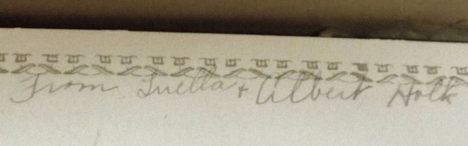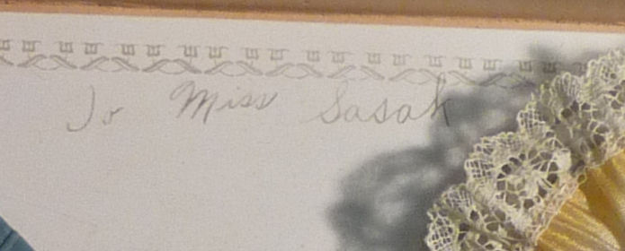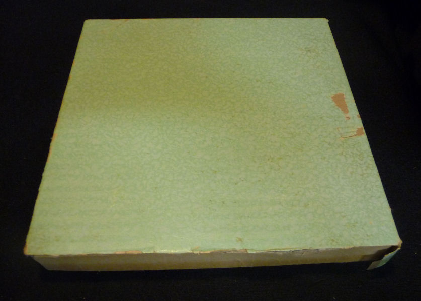 This adorable set is still mint in box and has never been used by Miss Sasah. The set consists of a lacy powder patter with ribbon wrapped wand, a lacy puff with ribbon rose in the center, and an aqua lace-edged hanky. The puff is still attached to the card in the box and the other two items, even though not attached, have never been used. On the card in the box is written "To Miss Sasah From Luella & Albert Holk". Great original set in mint condition! The patter measures 3-1/2" diameter x 10-1/2" long. The puff is 3-1/2" diameter and the hanky is about 8" square. The box has one side of the lid missing but is otherwise intact ... it measures 8-1/4" square x 1" deep. (Click on pic for more photos.) |