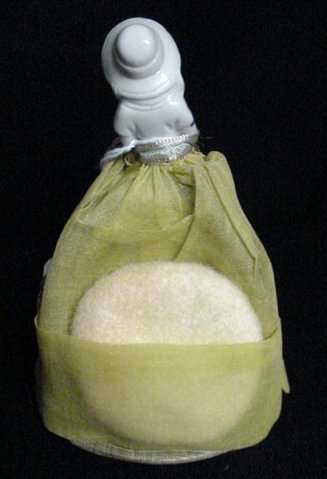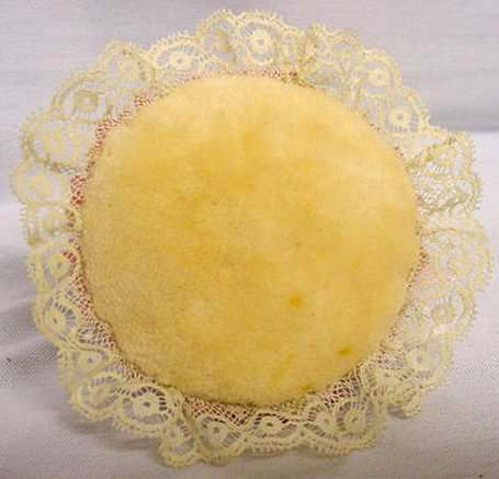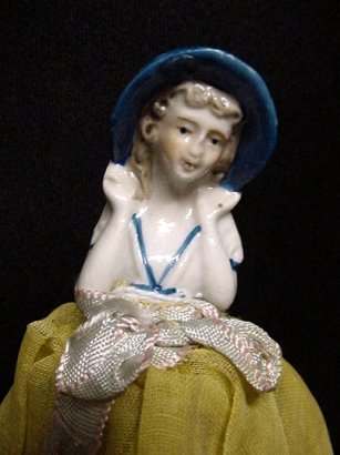 One of the hardest-to-find collectibles is this wonderful porcelain half doll with powder puff skirt. Wearing a wide-brimmed sun hat, this lovely miss has rosy cheeks and both hands raised. The skirt has wire hoop framing to enable the doll to stand freely on your dressing table. Sold in gift shops and mail order catalogs in the 20's and 30's, these puff dolls are listed as "Very Rare" in Lynell Schwartz's "Vintage Cmpacts & Beauty Accessories." This lovely lady measures 3-1/2" diameter at base x 5-1/2" tall. She is in exceptional condition for her age with no cracks, chips, or holes in her skirt. Please see all pictures for details. Includes 3 puffs. (Click on pic for more photos.) |