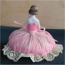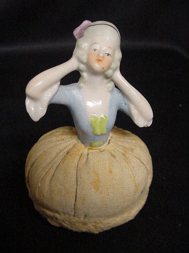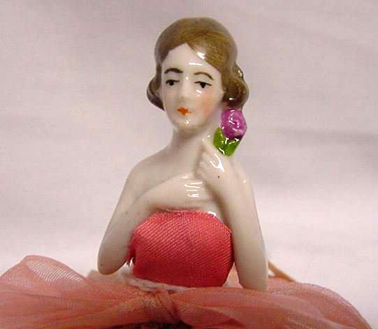 Such an adorable powder puff! Filmy pink material adorns this lovely half doll with arms raised to her shoulder where she holds a pretty flower. Lacy ruffle trims the puff while a pink ribbon is tied at her waist. Doll is porcelain and made in Germany. She is in excellent condition! (Click on pic for more photos.) |