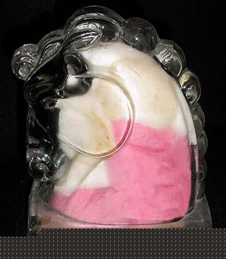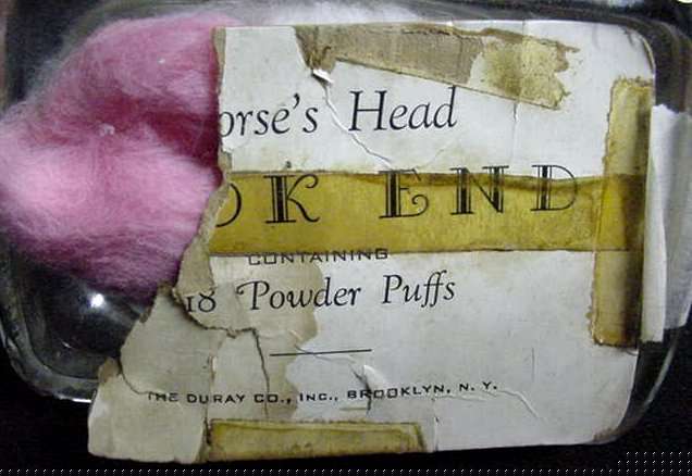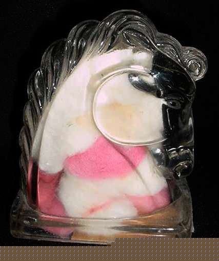 This is a fantastic original store item ... a glass horse's head book end which was filled with 18 powder puffs ... original label is still attached to bottom with old and new tape to hold it on. Label reads "Horse's Head Book End containing 18 Powder Puffs, Brooklyn, New York." We have not removed the cotton puffs from the horse and I assume they are all original. This is a great original collectible! Measures almost 5" x 3-1/4" x 5-1/2" high. (Click on pic for more photos.) |