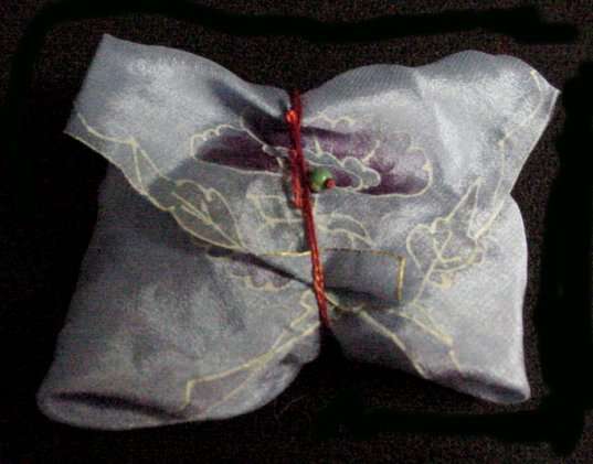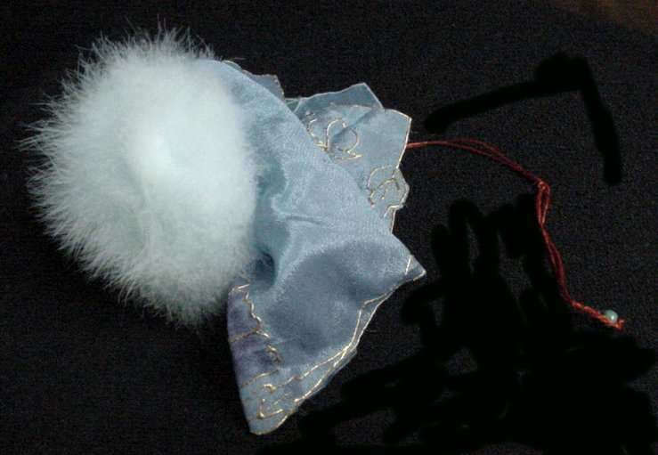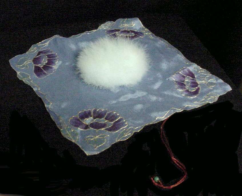 Adorable powder blue swansdown puff attached to a periwinkle blue silk hanky with purple flowers on each corner outlined in gold embroidery. Hanky corners fold over puff and there is a litle red cord with a beaded end to tie it shut. It is just darling! Appears to have never been used. Puff measures 3-1/2" diameter. Hanky is 8-1/2" square and is in excellent condition! (Click on pic for more photos.) |