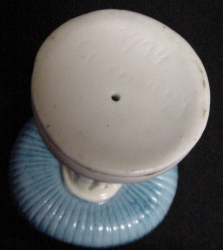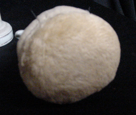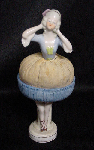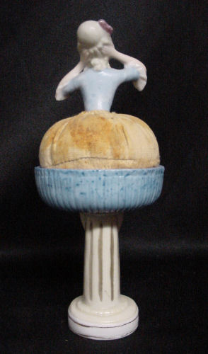 This is an extremely rare full-bodied porcelain doll powder puff. The top half with raised open arms has a powder puff attached "skirt" which rests in the other half of the skirt which has the legs attached. There was probably a tulle skirt at one time as this is a muslin-stuffed base but the original puff is still attached to the bottom. It would be a simple matter to attach a piece of vintage tulle or lace if desired but this was as we found her so we are leaving her this way. It is marked Germany on the base. Overall in excellent condition with no chips or cracks. Measures 6" high total. Skirt portion is 2-1/2" wide x 2" front-to-back x 3-7/8" high. (Click on pic for more photos.) |