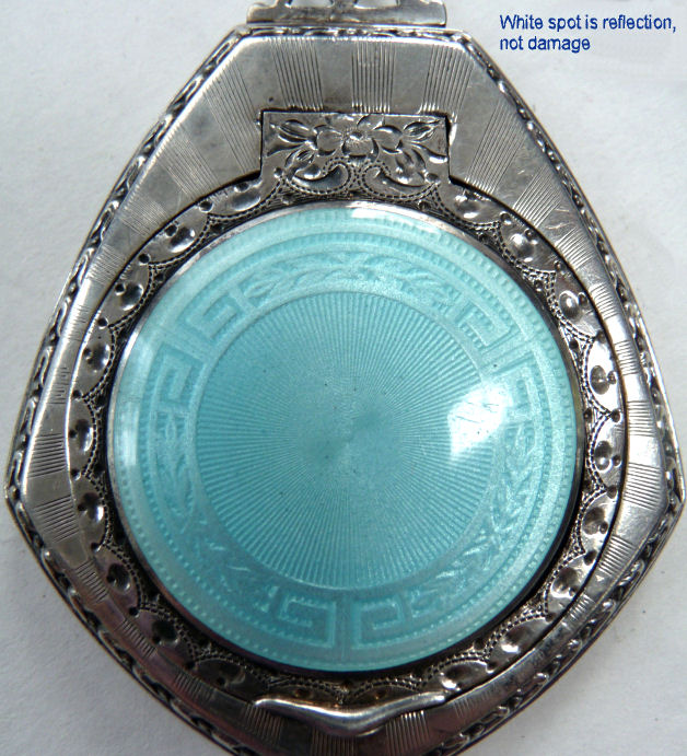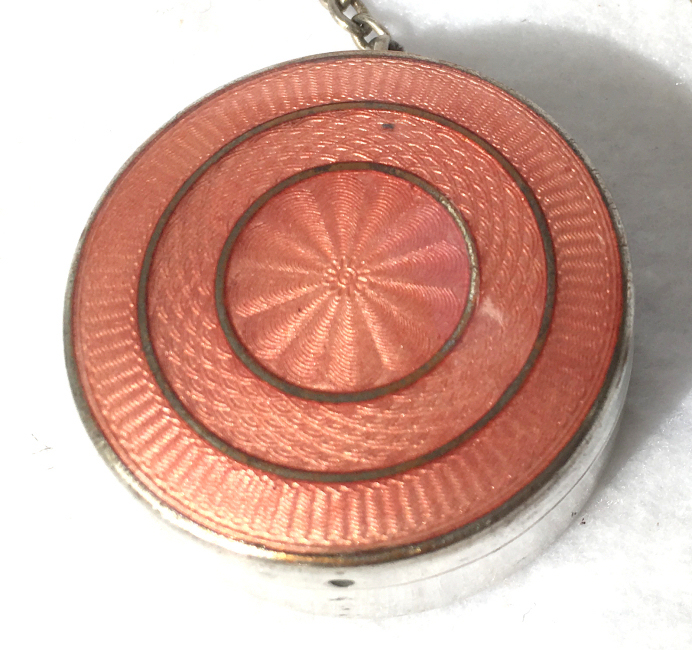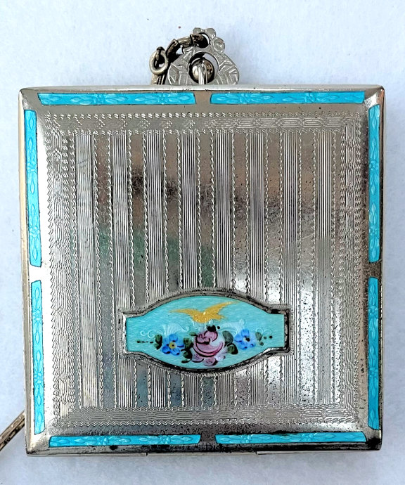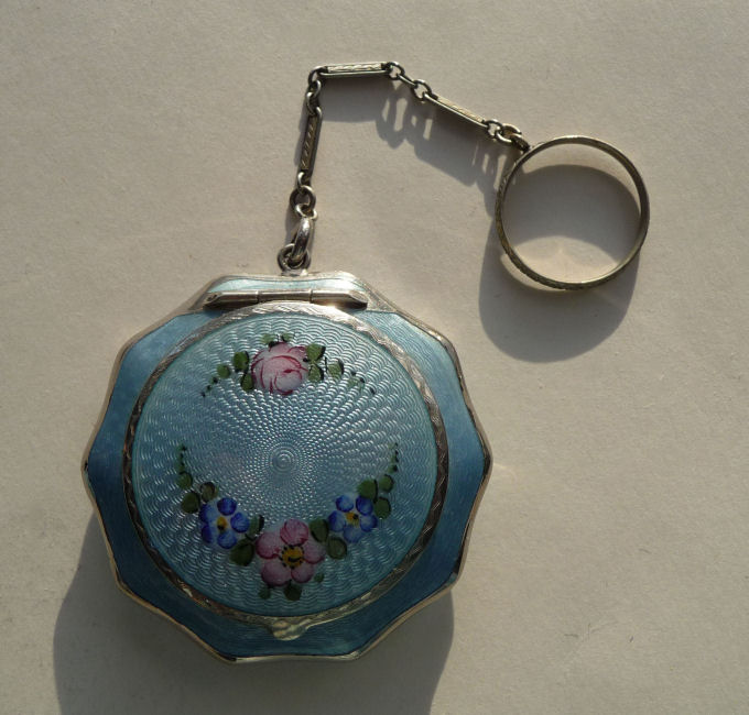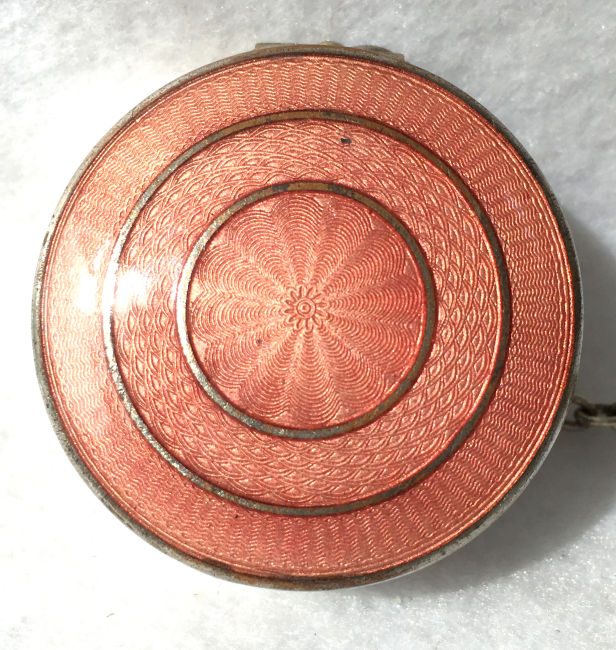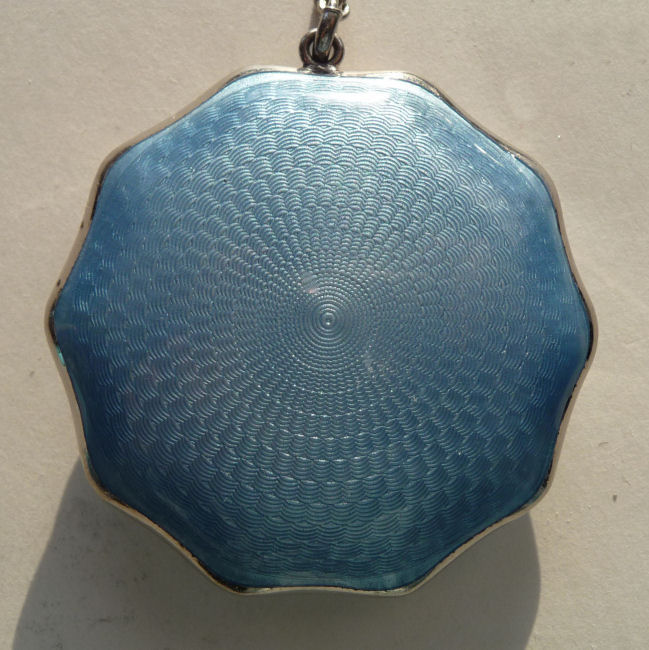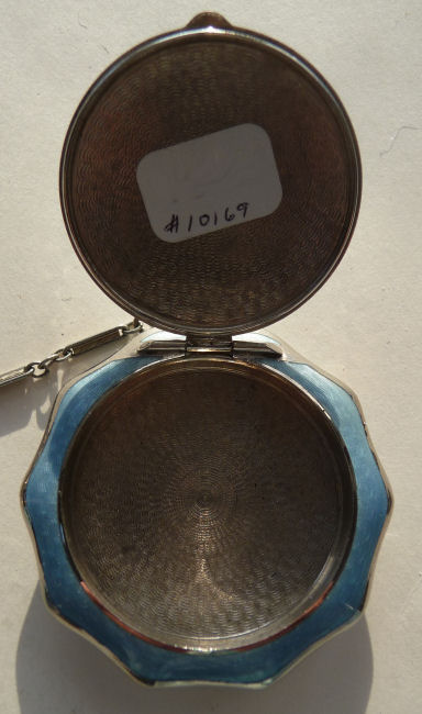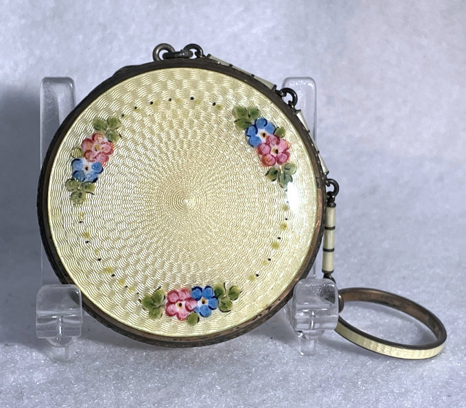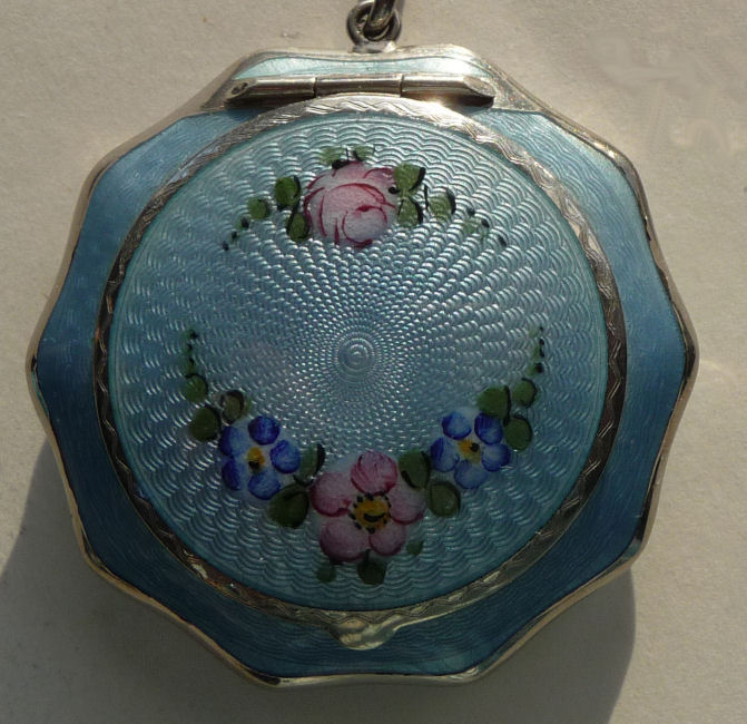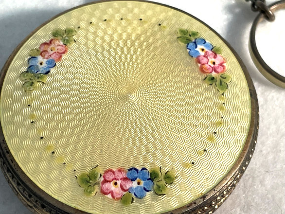 Here is a very pretty little tango compact in a scalloped shape in double enamel guilloche, meaning both front and back are completely done in enamel guilloche. The base metal is silver but not sterling. There are hand-painted flowers on the front. The compact is missing the mirror in the lid and the base is empty to hold a powder pat. The chain and finger ring are both embossed and the chain is removable. Enameling is all in excellent shape with only the most superficial scuffs only visible when held to light or with a loupe. , so I don't believe it is. I bought this in 2002 and I am pricing it at what I paid for it because of the missing mirror. Measures 2-1/8" diameter at the points. (Click on pic for more photos.) |