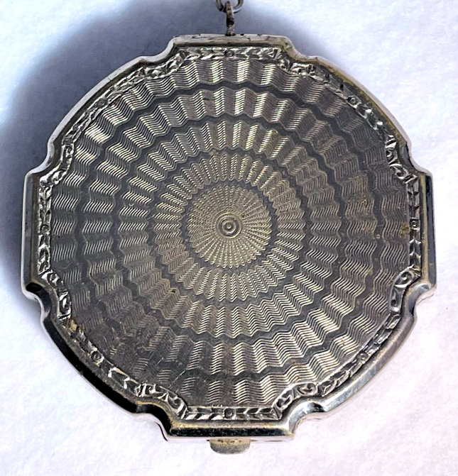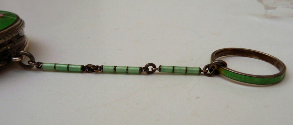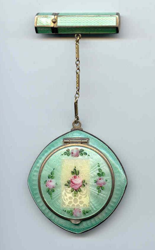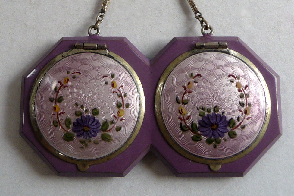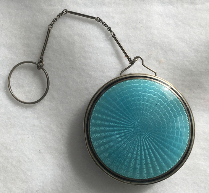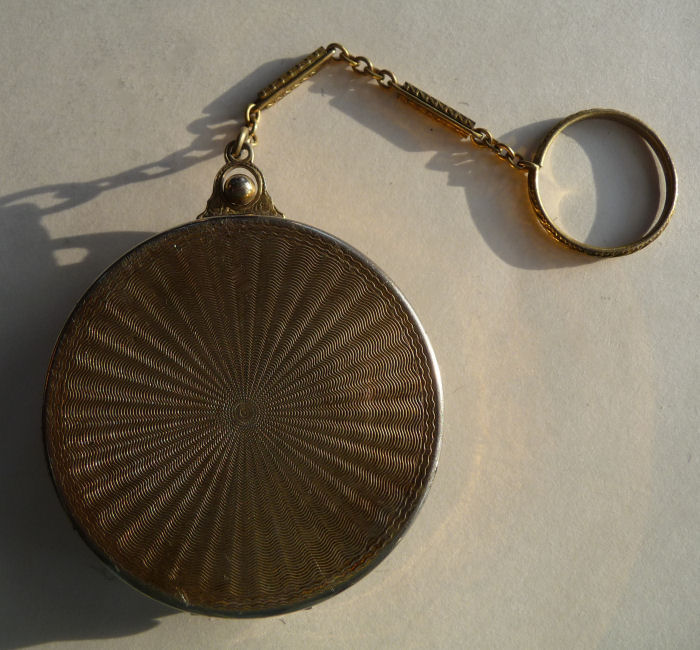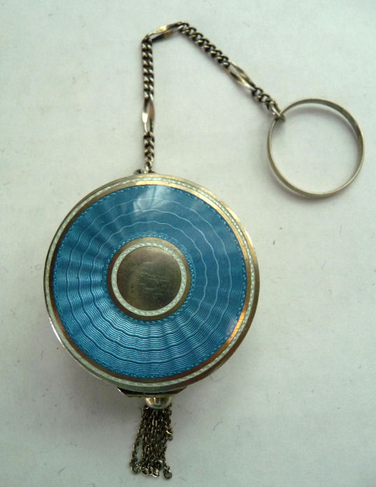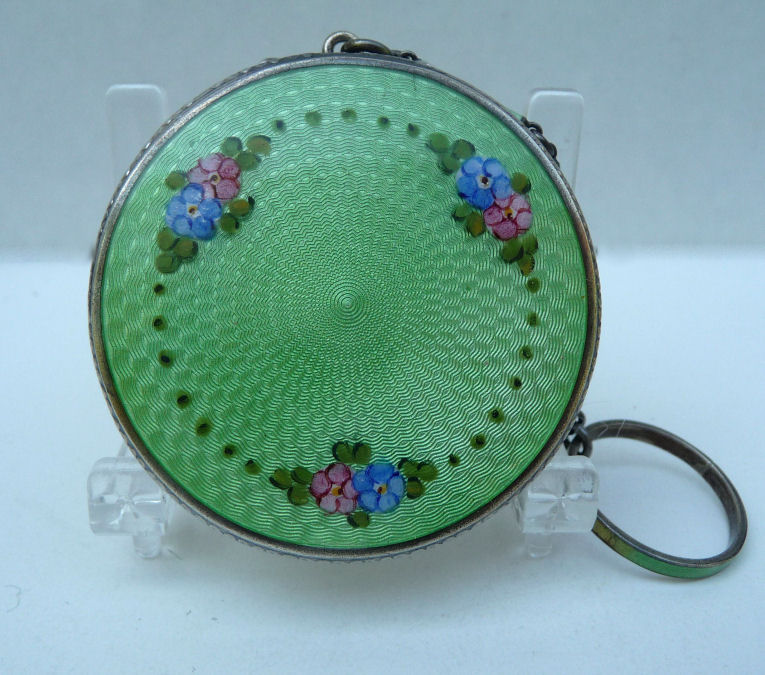 Here is a very pretty little tango compact in a scalloped shape in double enamel guilloche, meaning both front and back are completely done in enamel guilloche. The base metal is silver but not sterling. There are hand-painted flowers on the front. The compact is missing the mirror in the lid and the base is empty to hold a powder pat. The chain and finger ring are both embossed and the chain is removable. Enameling is all in excellent shape with only the most superficial scuffs only visible when held to light or with a loupe. , so I don't believe it is. I bought this in 2002 and I am pricing it at what I paid for it because of the missing mirror. Measures 2-1/8" diameter at the points. (Click on pic for more photos.) |