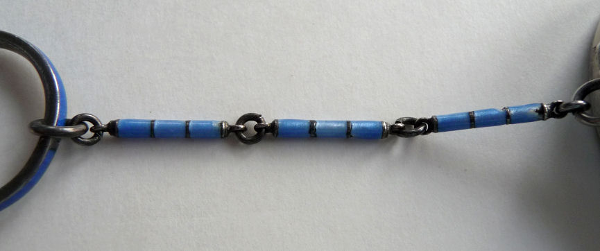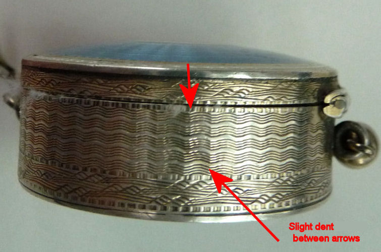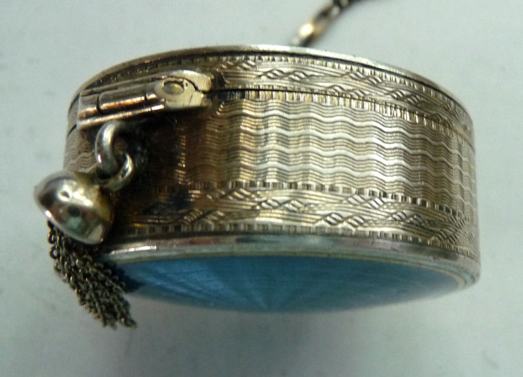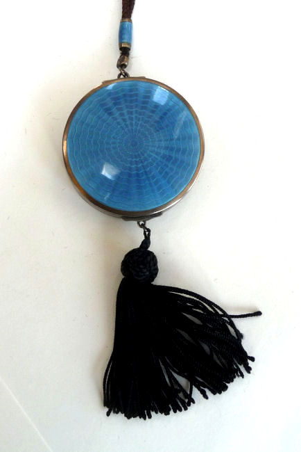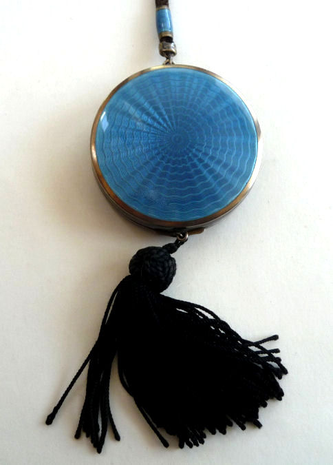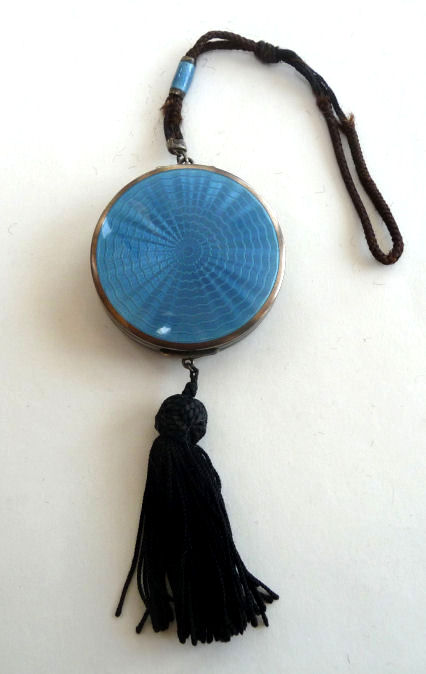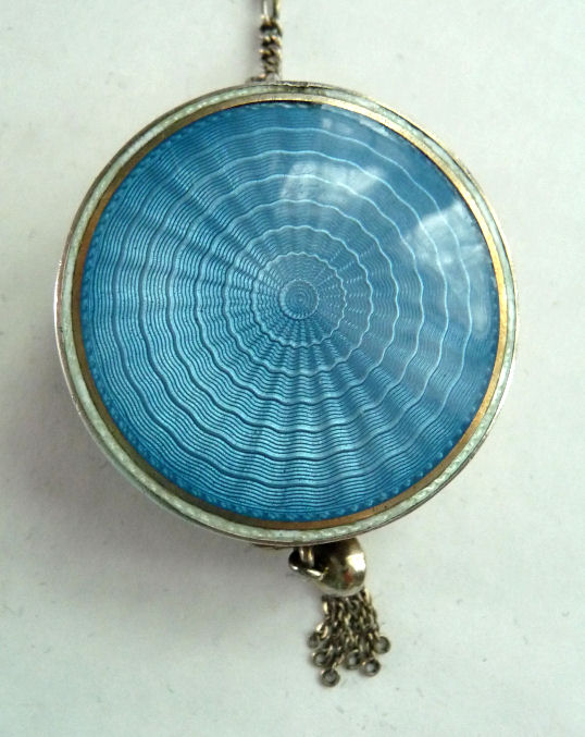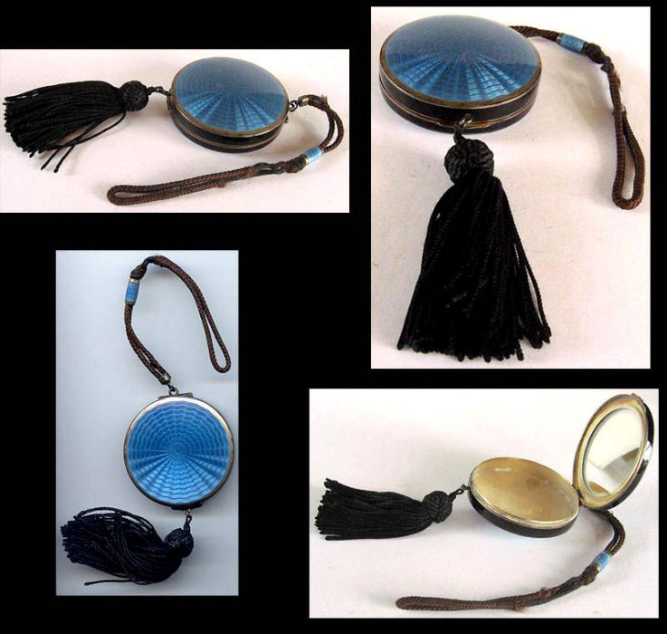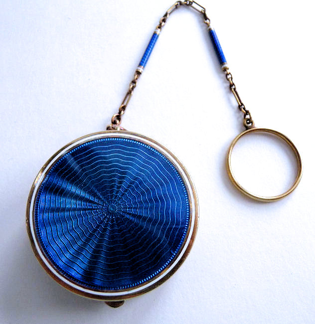 This is a very pretty little tango compact made by F & B in sterling silver with both sides covered in cornflower blue enamel guilloche. There is also a white enameled ring in the center on the front side and around the outer edge on both front and back (see pics). Inside is a round mirror in the lid and an open compartment in the bottom for powder ... included also is a little blue swansdown puff. The finger ring is on the end of a lovely chain with small links and elongated decorative twisted links in between. The sides of the case have gorgeous damascened designs in the metal ... so pretty! And there is the sweetest little bell tassel at the bottom. There are a few apologies on this one which is keeping the price very reasonable ... there is a slight dent on the one side and on the back of the compact; at the top edge, there are two very minimal fleabites in the enamel (visible in the pictures). Compact portion measures 1-1/2" diameter x almost 3/4" deep (slightly convex). (Click on pic for more photos.) |