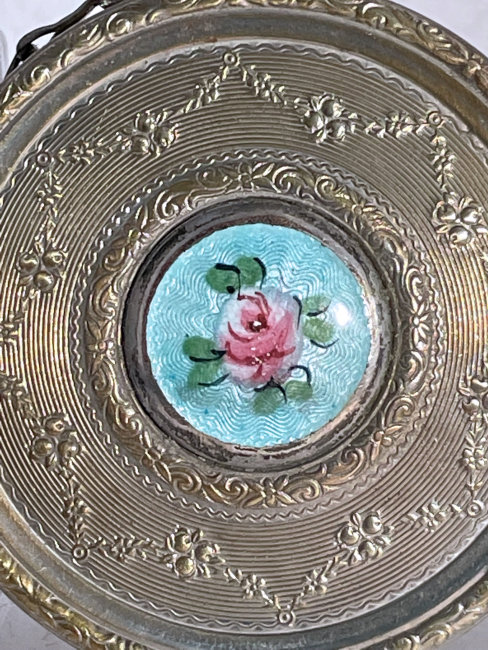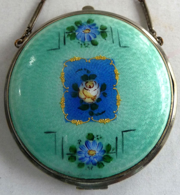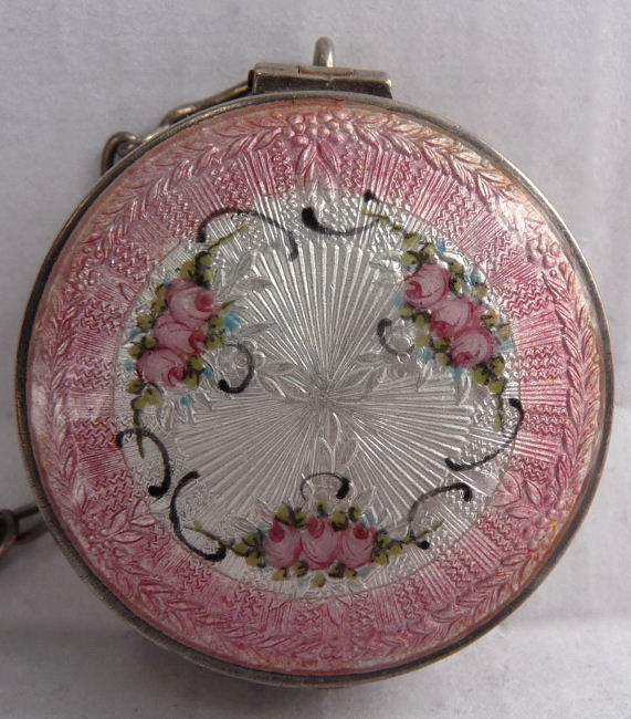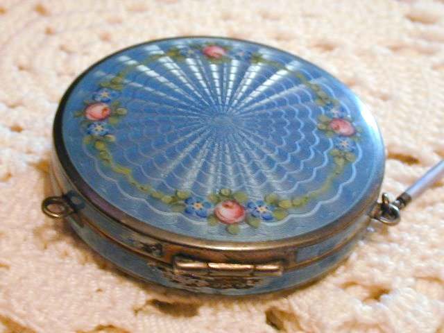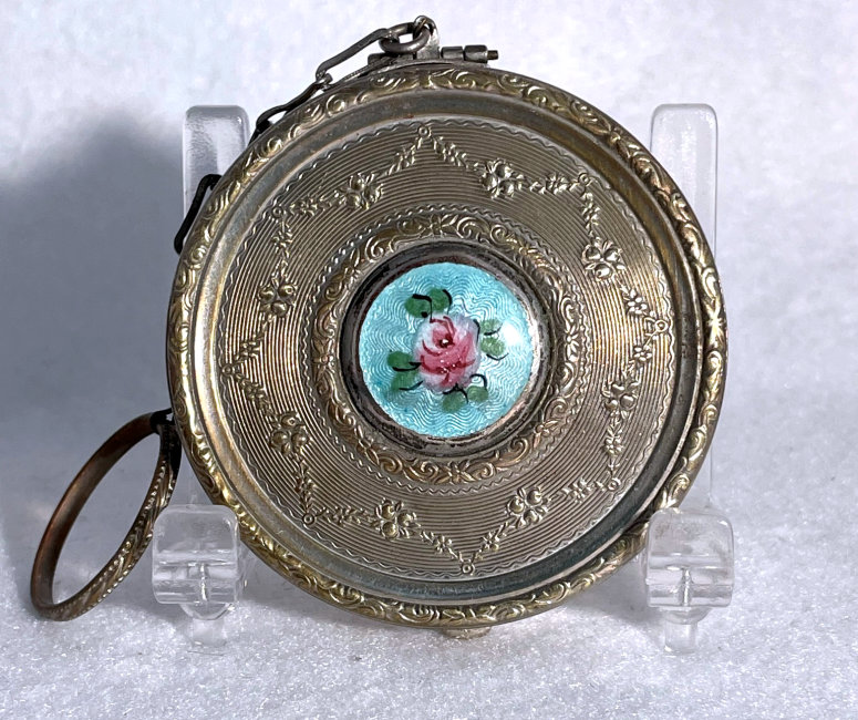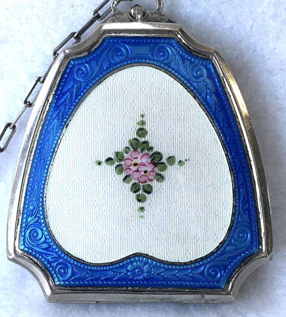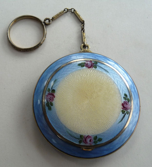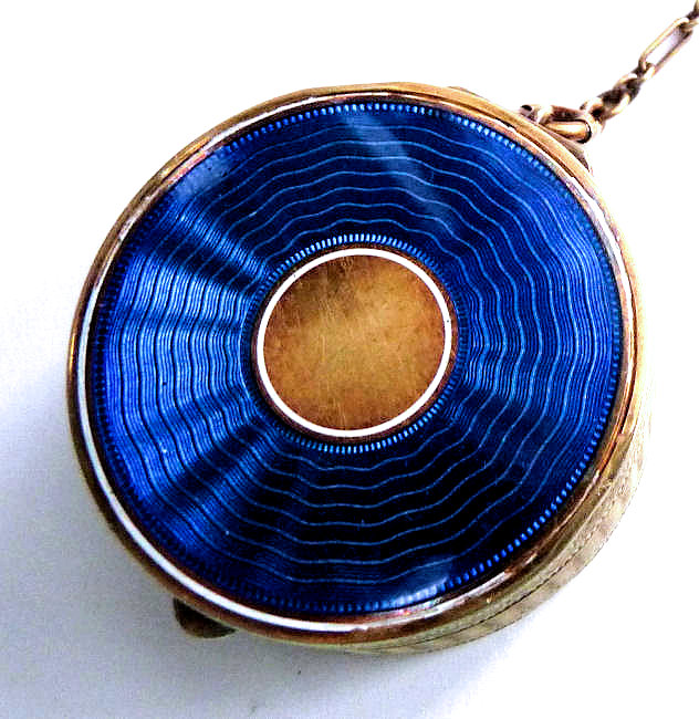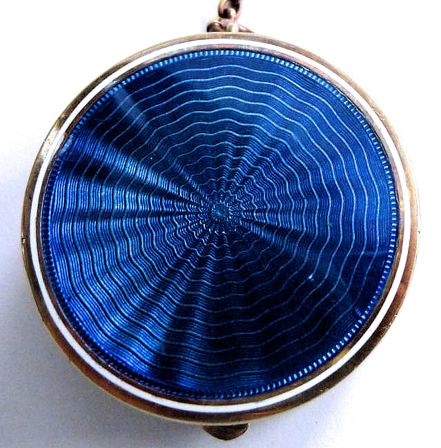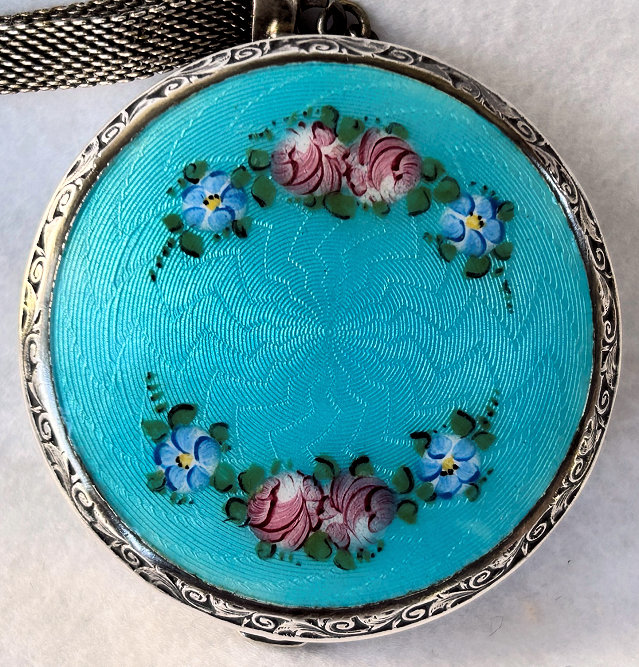 Here is a very pretty unmarked tango compact done in full enamel guilloche on both front and back. The front features a creamy ivory center with blue border in which four pink roses have been hand-painted. The back is solid blue enamel guilloche in a radiating wavy design. The interior of the compact features a beautifully engine-turned rotating powder sifter in the base; in the lid is a metallic mirror which opens to reveal a rouge pot (no rouge). I have not been able to find a maker's mark although it could be beneath the sifter which I cannot remove. The finger ring and chain link bars are all richly embossed. Overall it is in excellent condition with no scratches or damage that I can see, only superficial scuffs visible when held to light or with a loupe. It is a wonderful piece and larger than the average compact ... it measures 2-1/4" diameter. (Click on pic for more photos.) |