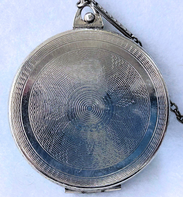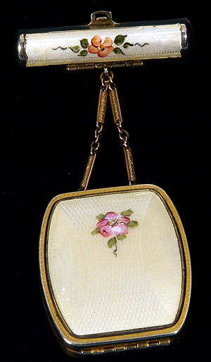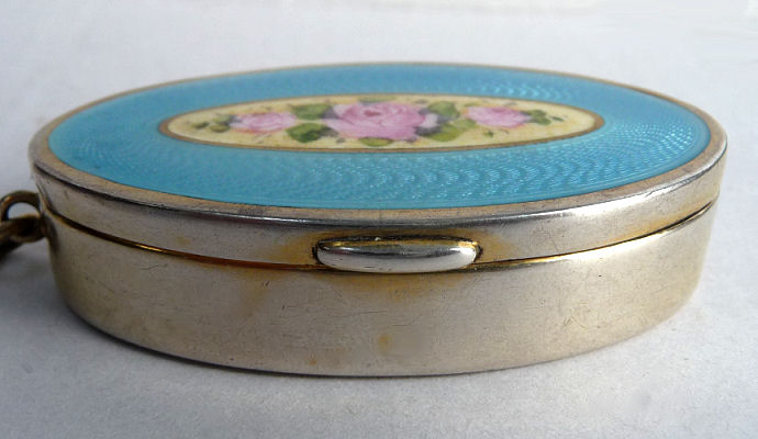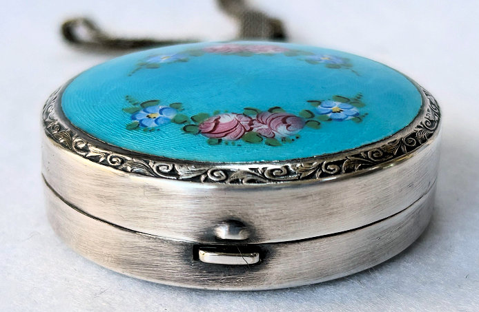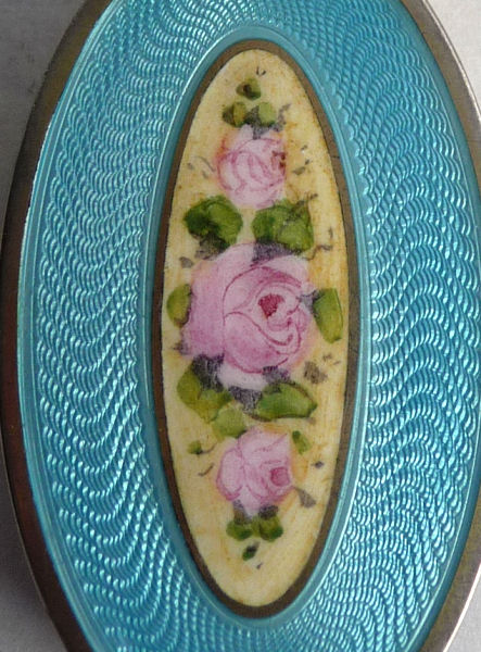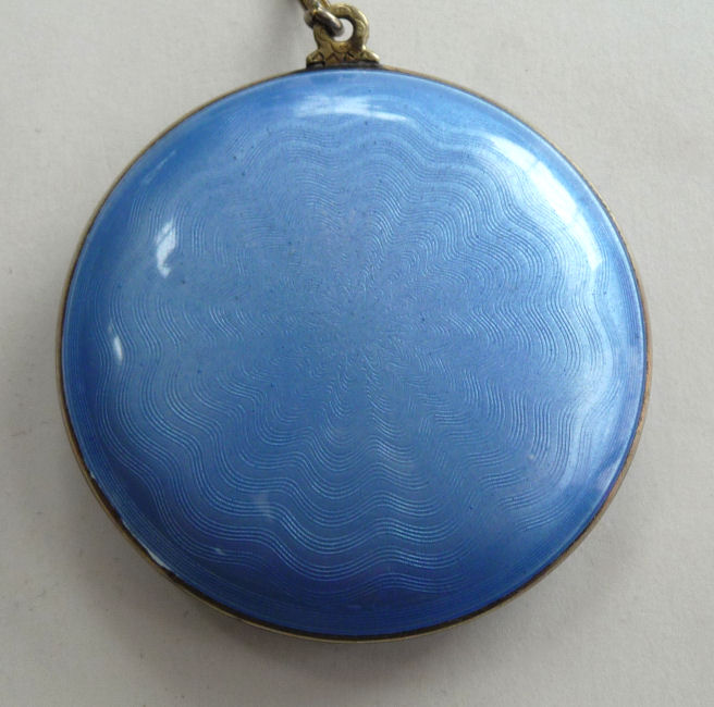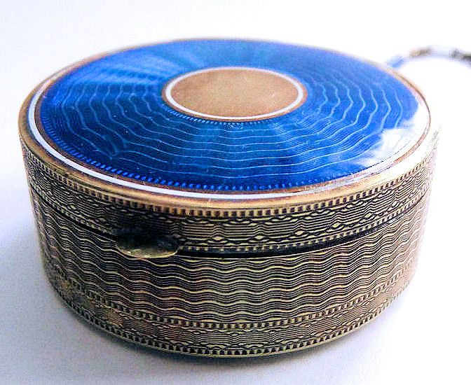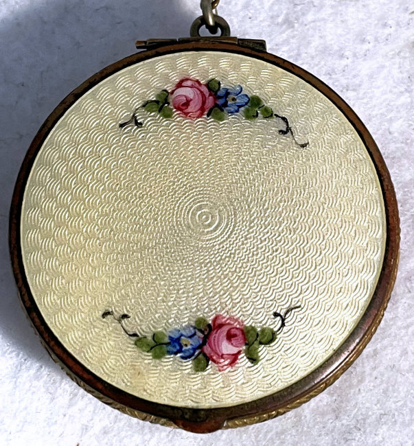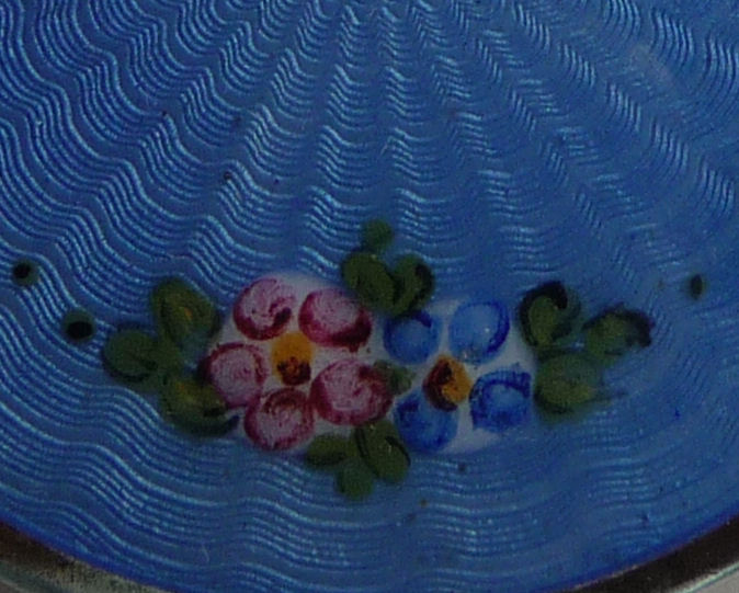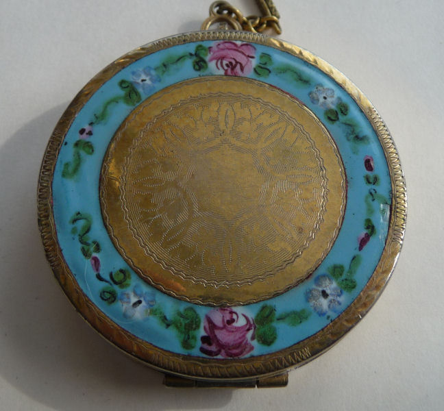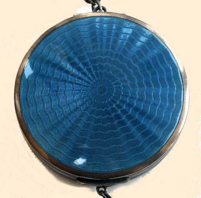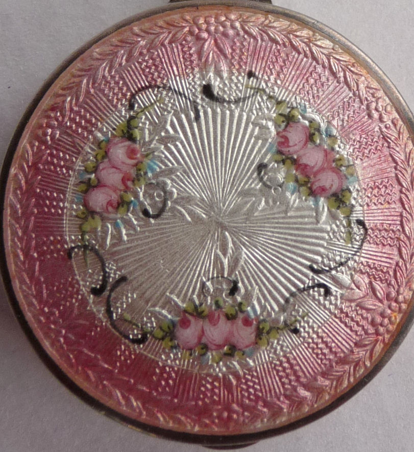 Here is a very pretty unmarked tango compact done in full enamel guilloche on both front and back. The front features a creamy ivory center with blue border in which four pink roses have been hand-painted. The back is solid blue enamel guilloche in a radiating wavy design. The interior of the compact features a beautifully engine-turned rotating powder sifter in the base; in the lid is a metallic mirror which opens to reveal a rouge pot (no rouge). I have not been able to find a maker's mark although it could be beneath the sifter which I cannot remove. The finger ring and chain link bars are all richly embossed. Overall it is in excellent condition with no scratches or damage that I can see, only superficial scuffs visible when held to light or with a loupe. It is a wonderful piece and larger than the average compact ... it measures 2-1/4" diameter. (Click on pic for more photos.) |