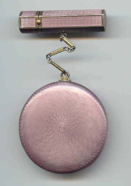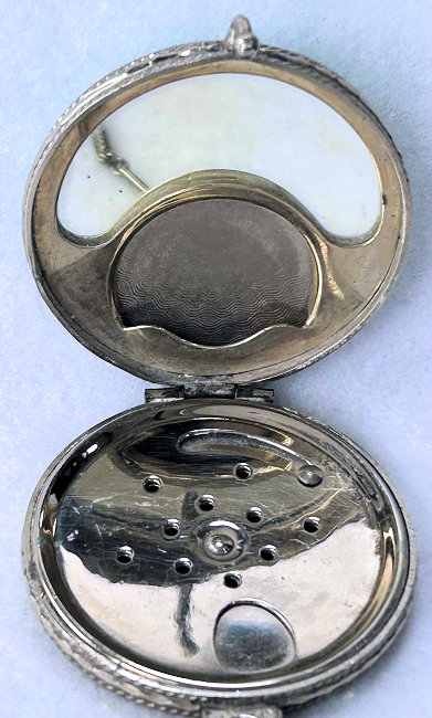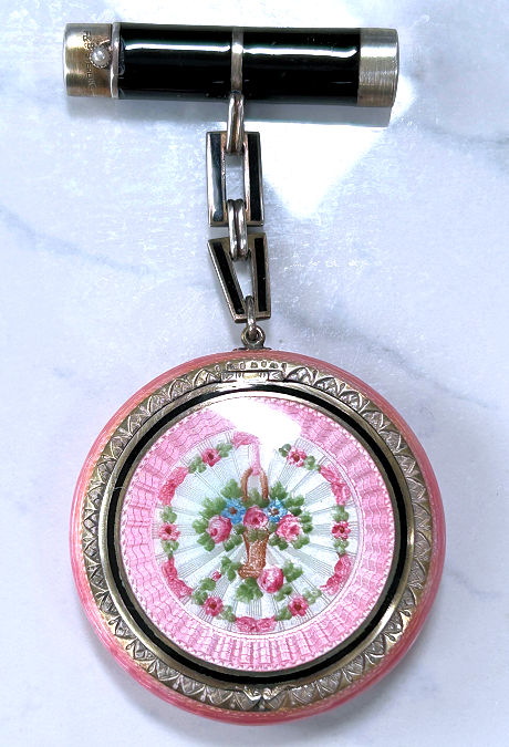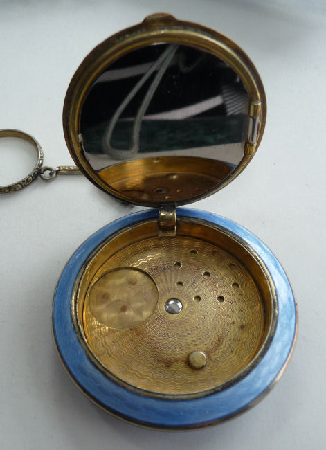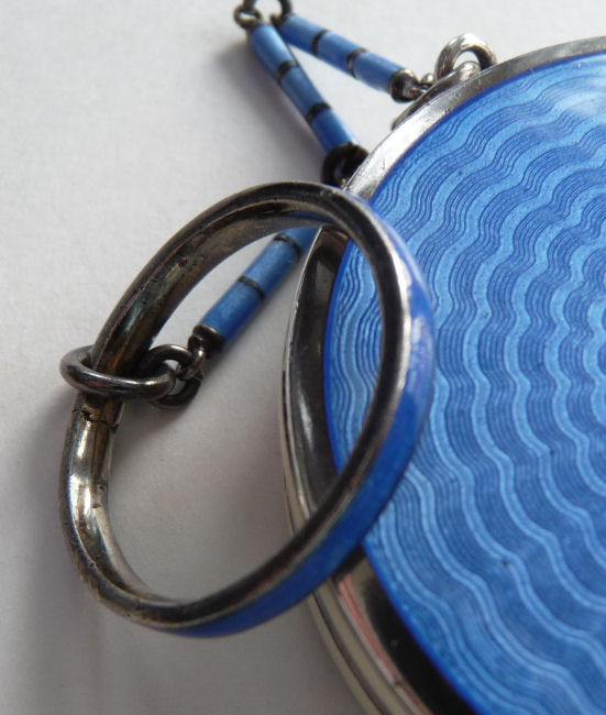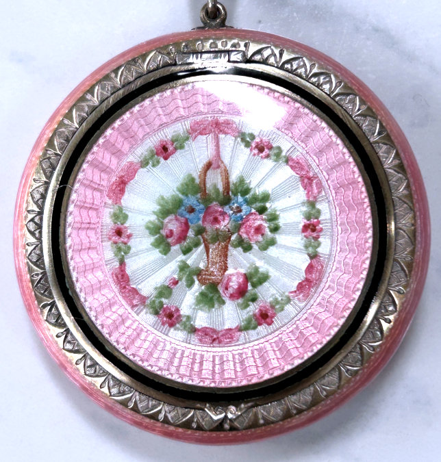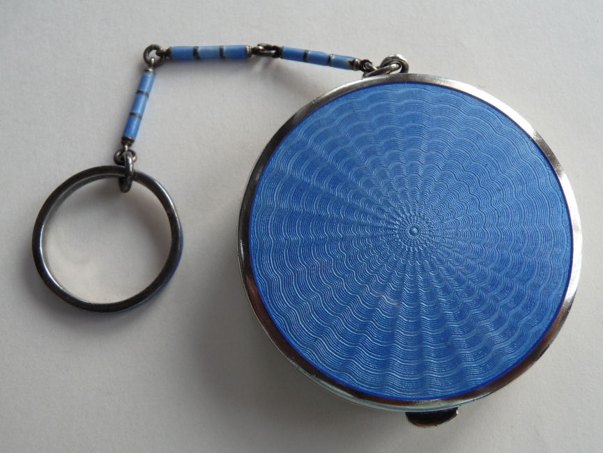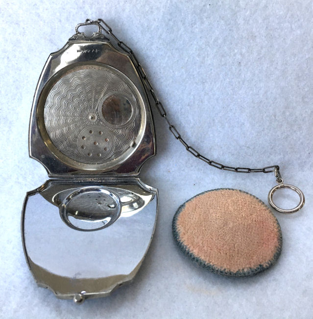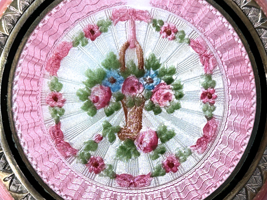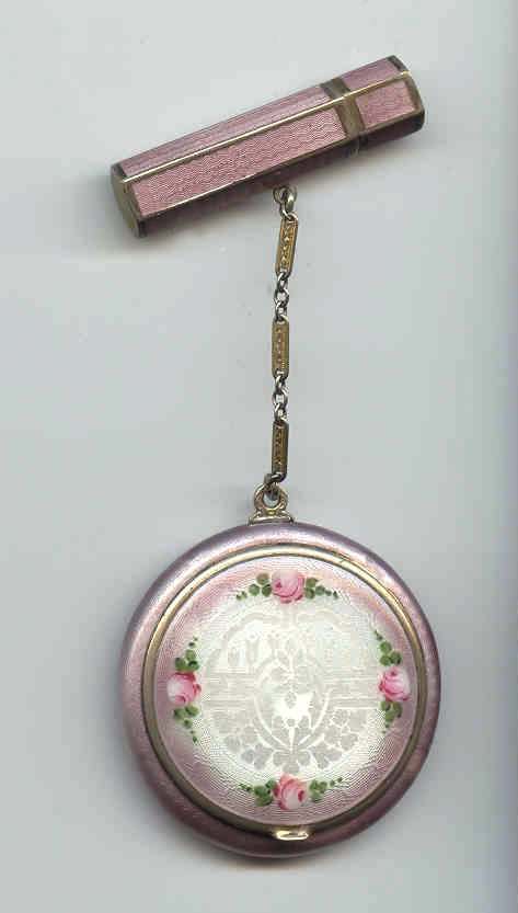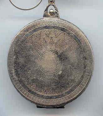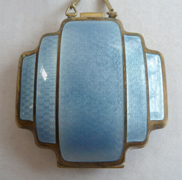 Here is a very pretty unmarked tango compact done in full enamel guilloche on both front and back. The front features a creamy ivory center with blue border in which four pink roses have been hand-painted. The back is solid blue enamel guilloche in a radiating wavy design. The interior of the compact features a beautifully engine-turned rotating powder sifter in the base; in the lid is a metallic mirror which opens to reveal a rouge pot (no rouge). I have not been able to find a maker's mark although it could be beneath the sifter which I cannot remove. The finger ring and chain link bars are all richly embossed. Overall it is in excellent condition with no scratches or damage that I can see, only superficial scuffs visible when held to light or with a loupe. It is a wonderful piece and larger than the average compact ... it measures 2-1/4" diameter. (Click on pic for more photos.) |