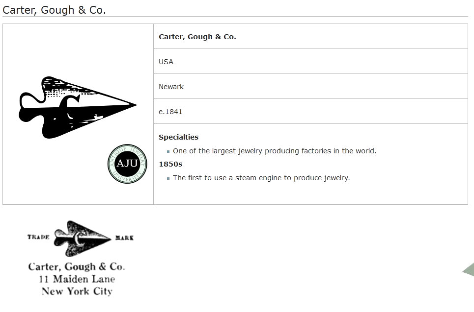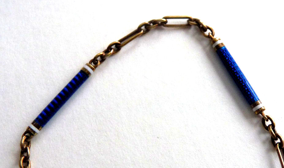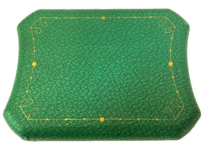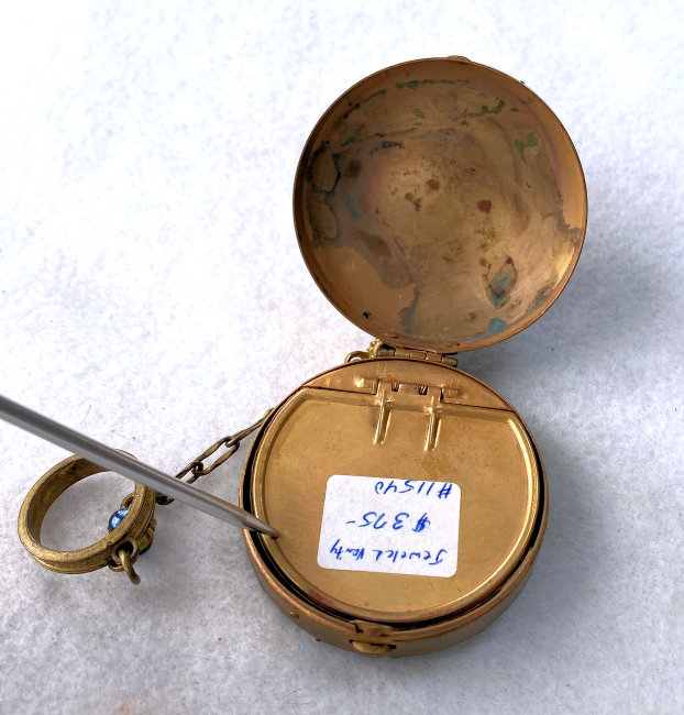 Very rarely do you ever run across 14 kt. gold compacts ... and this one made by Carter, Gough & Co.* is exceptionally beautiful. The case is all damascened in exquisite designs all the way around the sides. The top and bottom of the case are done in a deep shade of blue -- not as dark as navy or cobalt but a rich blue. Around these blue sections is a thin band of white for accent. Both colors are picked up in the long links in the attached (removable) chain which has a finger ring at the top. Inside the compact is a mirror in the lid which has darkened and spotted with age and an original ribboned puff in the base. The inside of the case is also engine-turned in beautiful swirling designs. As for condition, the back of the compact and the enameled links in the chain are all perfect. The top side of the compact has a few issues that I need to point out. The outer band of white enamel is missing some areas ... this band is so narrow that at a glance I did not even notice it. In fact, it wasn't until I took the supersized close-ups for this listing that I even saw it. So it is really pretty insignificant but if it is bothersome to you, you can always display it with the other side up as they are identical. There are also two "dents" in the very edge of the top ... I believe these will show up in the pictures as well. Again, they aren't that big of a deal and in a compact of this caliber, easily forgiven. The hallmark for Carter, Gough & Co. and the 14 kt stamp are on the rim of the compact. Measures approximately 1-1/2" diameter x 5/8" deep. Chain handle & ring are almost 5" long. *Carter, Gough & Co. was a prominent jewelry maker from 1841-1922. They were known particularly for their fine quality jewelry and enamel guilloche. (Click on pic for more photos.) |