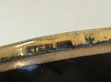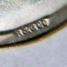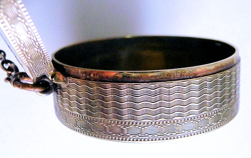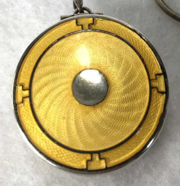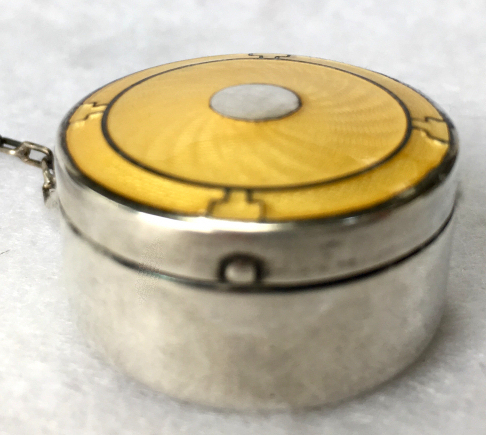 This tiny sterling silver compact has a lovely yellow enamel guilloche lid with three different guilloche designs (see the photos for the close-up) and a finger ring for carrying. "Guilloche" refers to the designs beneath the enamel which are engraved into the base metal. All of the enamel is in excellent condition with no damage whatsoever. The interior of the compact is done in a gold vermeil and features a mirror in the lid and a swansdown puff in the bottom. The only marking on this compact is the word "STERLING" stamped on the bottom, so I have no idea of the manufacturer but would assume the New England area. It is very tiny measuring just a tad over 1" diameter x a bit over 1/2" deep. Chain handle has 4" drop including the finger ring. (Click on pic for more photos.) |
