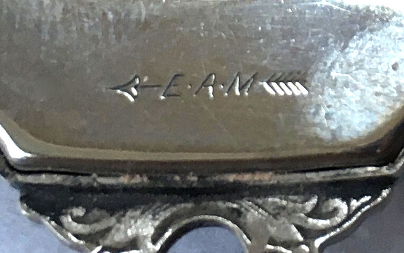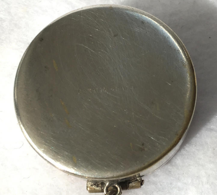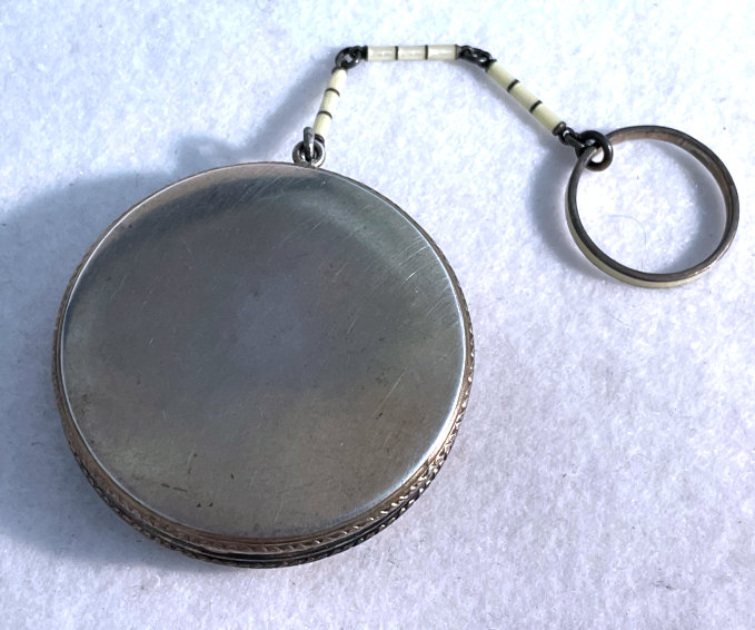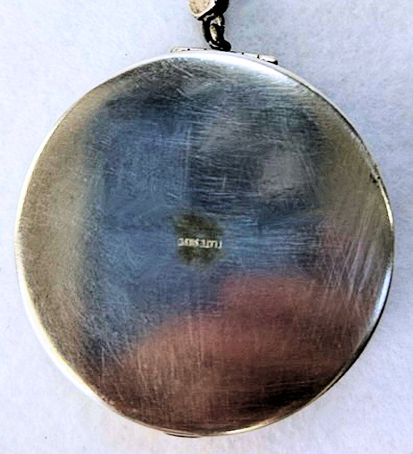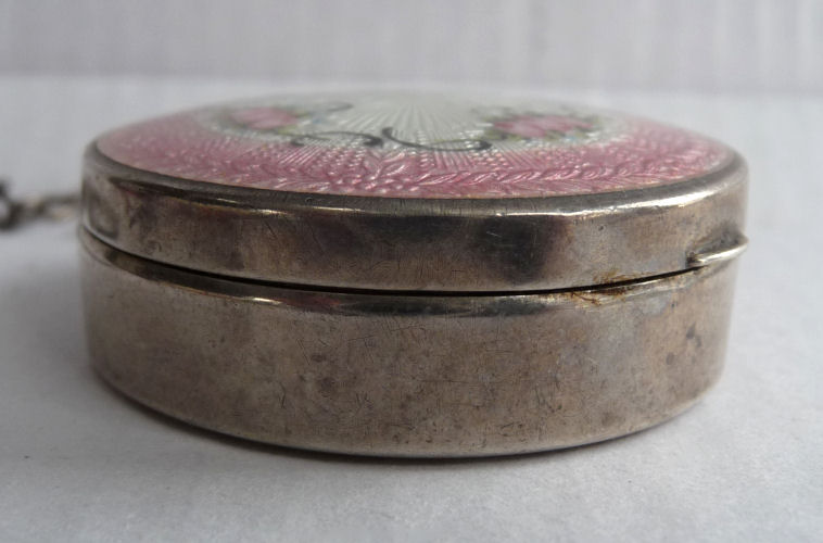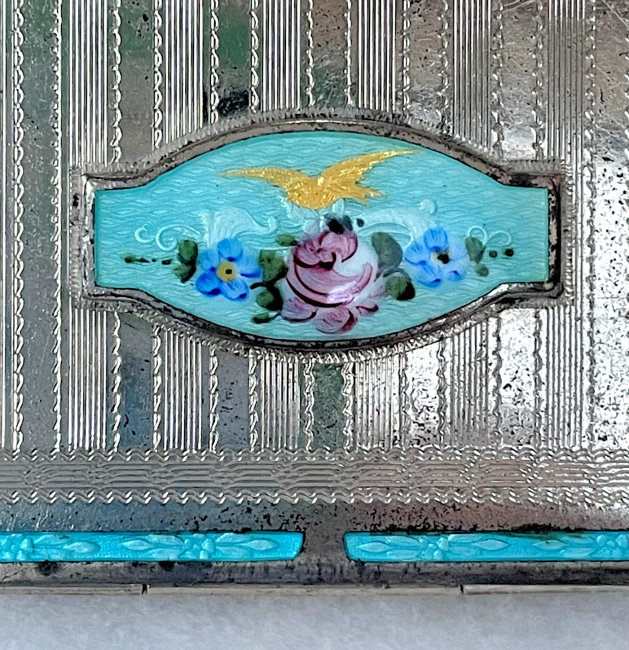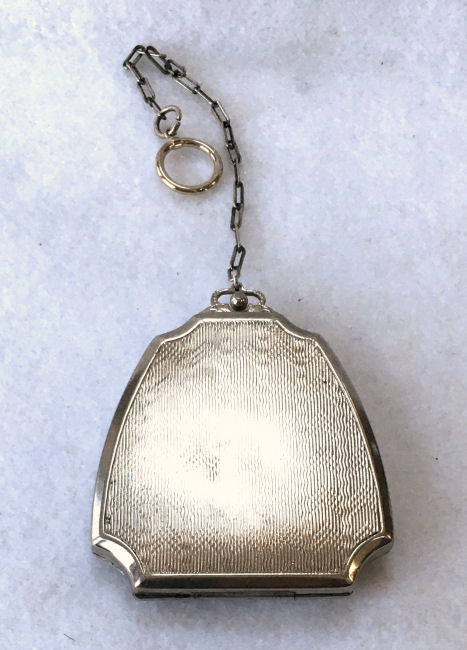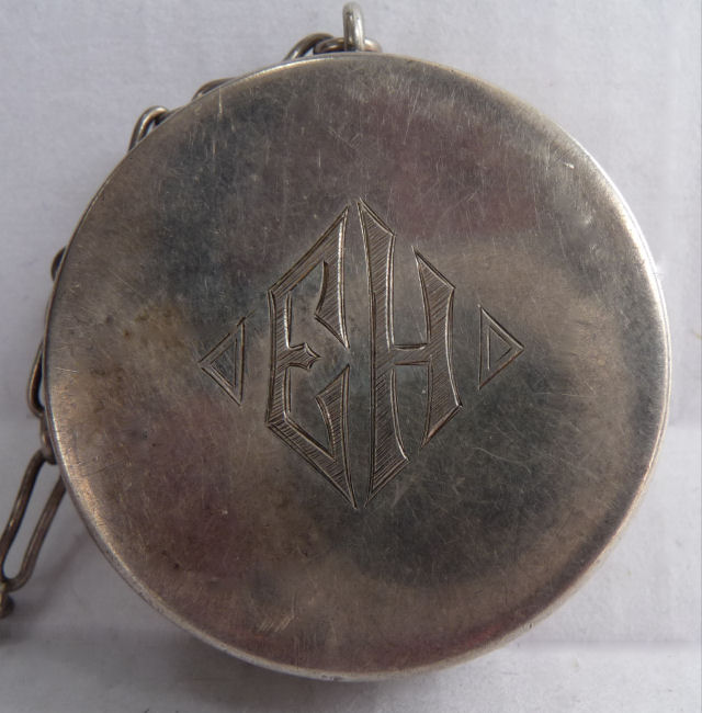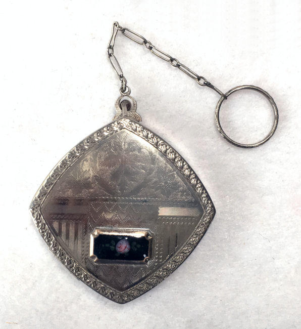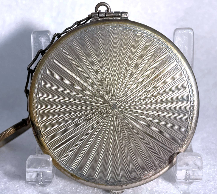 This is a delightful sterling silver tango compact whose manufacturer is unknown. The only marking I can find is a Sterling stamp in the rim of the base (I could not get a clear enough photo of it to share). The enamel guilloche with the hand-painted roses is done with a white center and a pink border. The designs in the guilloche are exquisite! The back of the compact is plain silver with the monogram "EH" engraved. Inside the base is empty and would have held loose powder and a puff. The mirror which was in the lid is no longer there but would be easily replaced. The finger ring is a plain band and the links have several bends which I don't believe are original but one never knows. Compact measures 1-1/2" diameter x 1/2" high (not counting slightly domed top). (Click on pic for more photos.) |