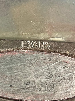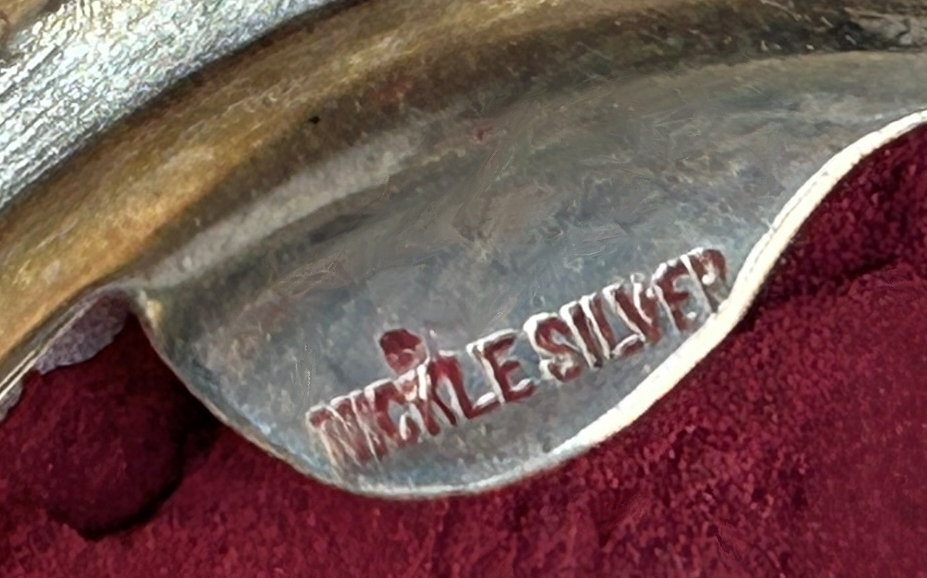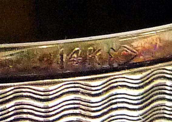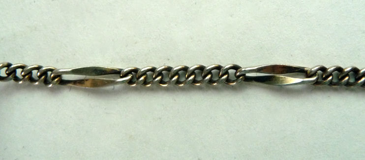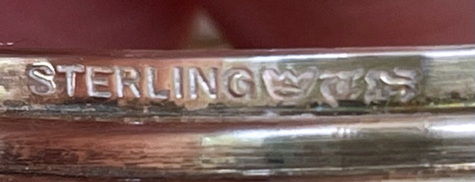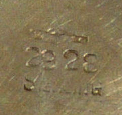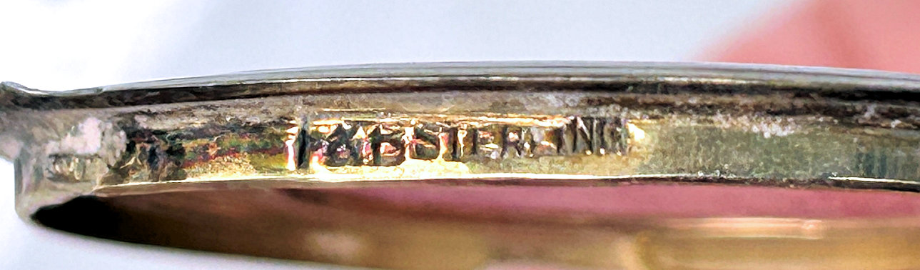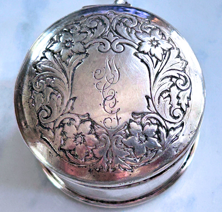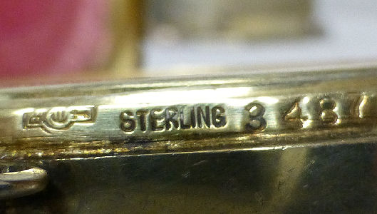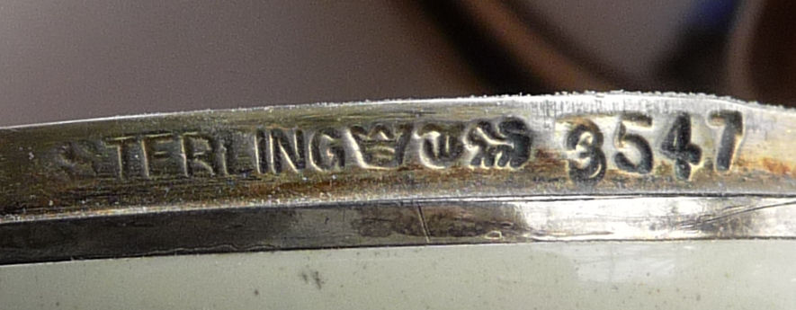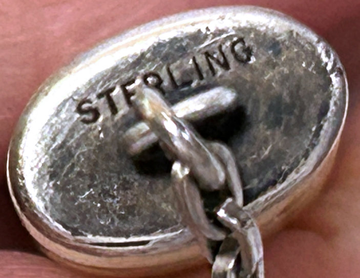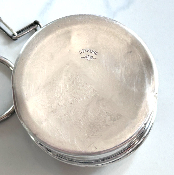 This is a delightful sterling silver tango compact whose manufacturer is unknown. The only marking I can find is a Sterling stamp in the rim of the base (I could not get a clear enough photo of it to share). The enamel guilloche with the hand-painted roses is done with a white center and a pink border. The designs in the guilloche are exquisite! The back of the compact is plain silver with the monogram "EH" engraved. Inside the base is empty and would have held loose powder and a puff. The mirror which was in the lid is no longer there but would be easily replaced. The finger ring is a plain band and the links have several bends which I don't believe are original but one never knows. Compact measures 1-1/2" diameter x 1/2" high (not counting slightly domed top). (Click on pic for more photos.) |