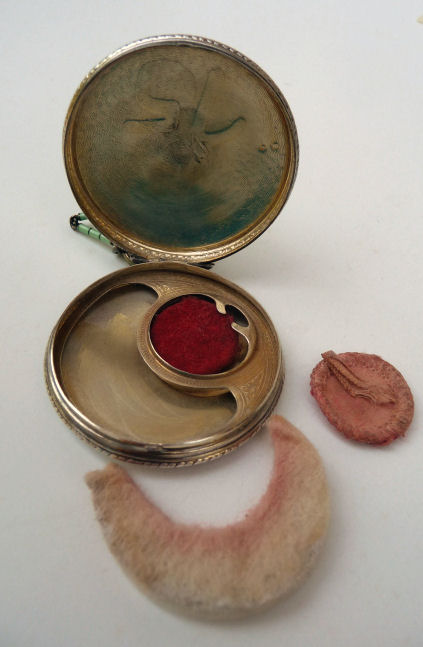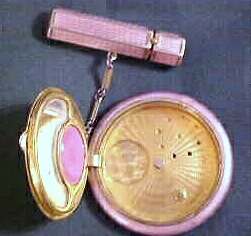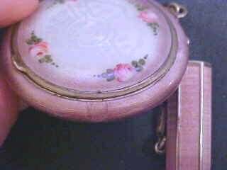 This is just a beautiful set! Lovely lavender color with a snow white center all done in enamel guilloche with hand-painted roses. It is truly gorgeous! The interior is all done in gold vermeil and features a crescent mirror in the lid with rouge pot (still intact!). The base has a beautifully engine turned rotating sifter. The matching lipstick case is six-sided and in mint condition. There are two professional repairs on the very edge of the compact itself (see pic for one ... other was too tiny to photograph). I purchased it even with this due to the rare and beautiful color. Finberg was known for its high quality and it shows in this beautiful piece. Compact measures 2-1/2" diameter and lipstick is almost 2" long. (Click on pic for more photos.) |