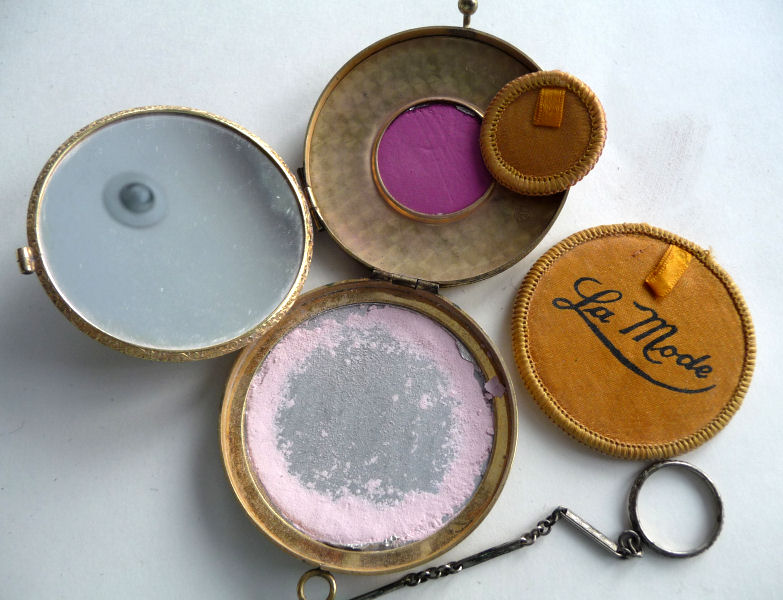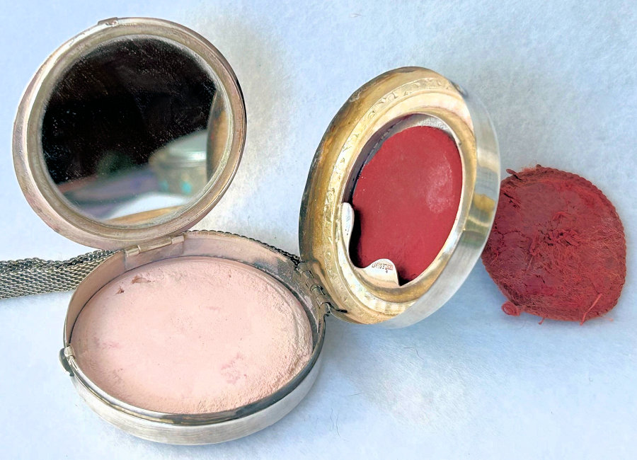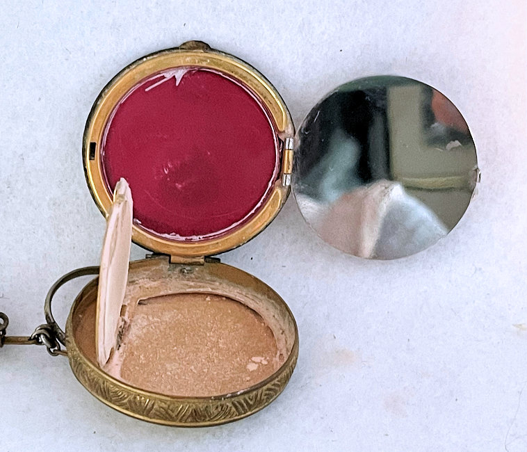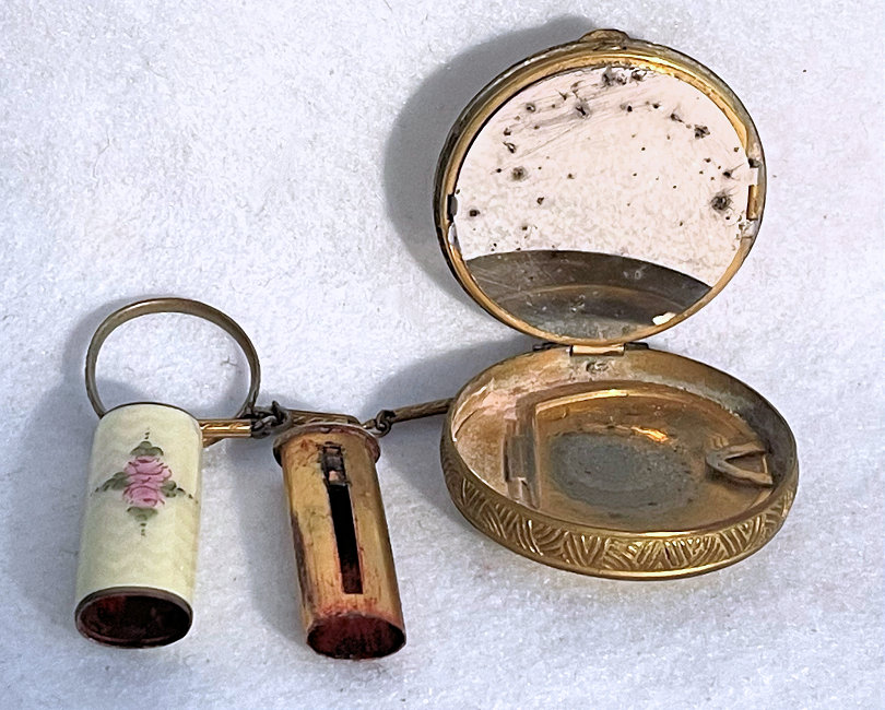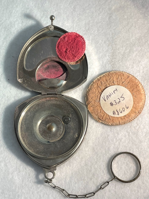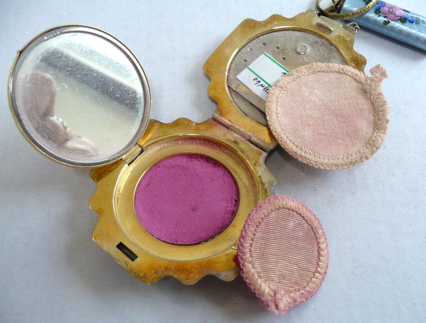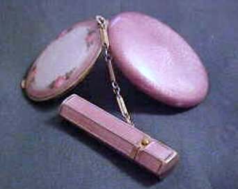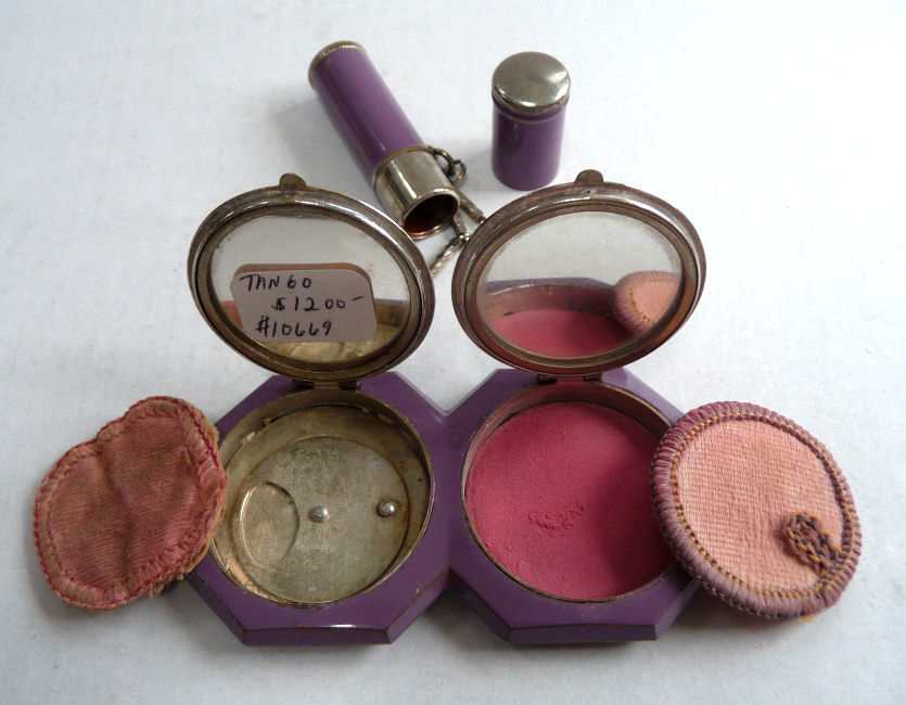 This rare double tango compact has been a prize in my collection for many, many years and I am ready to say good-bye to it. In all my years of collecting, I have never seen another like it. I have no idea of the manufacturer as there are no marks on it that I can find. It is done in plain purple enameling on the outer case of the compact and the matching lipstick but the two compact covers are a lighter purple enamel guilloche with a darker purple flower in the center of each and garlands with tiny yellow flowers. Each compact opens to reveal a mirror in the lids ... the left side has a puff (not original) with rotating powder sifter and the right side has an original puff with rouge pat beneath. The lipstick opens and has a thumbscrew at the base to push the lipstick up but I cannot get it to move and don't want to force it. The lids are both in excellent condition. There are some very teeny fleabites in the purple enameling on the lipstick and some edge wear (again, very faint) on the sides of the compact but not noticeable unless you are really looking closely. Overall I would rate it a 9+ out of 10 and considering its rarity, totally acceptable. Compacts measure a bit over 3" across x 1-5/8" high. Lipstick is 2" long x almost 1/2" diameter. (Click on pic for more photos.) |