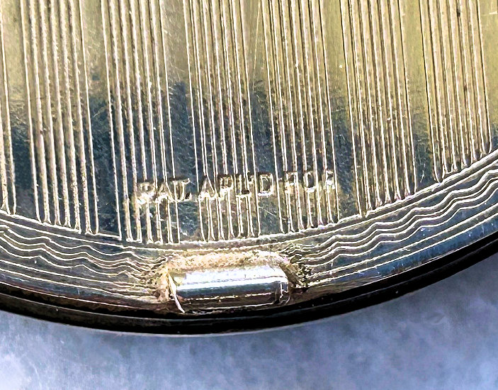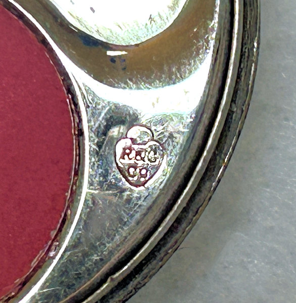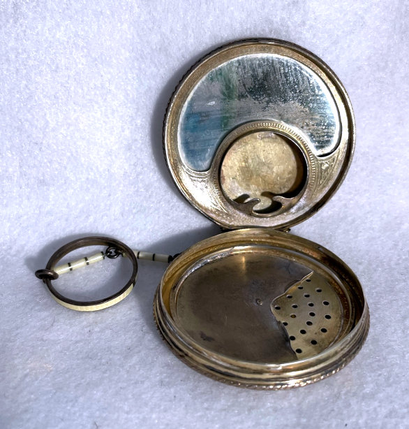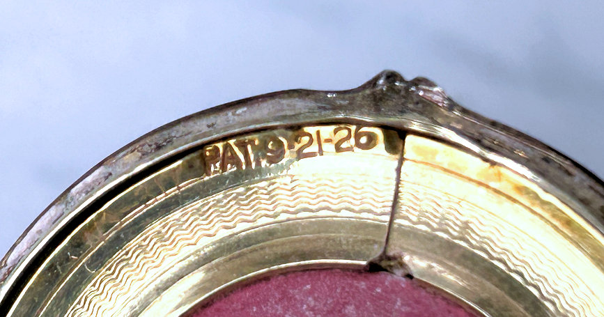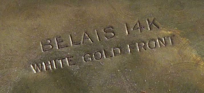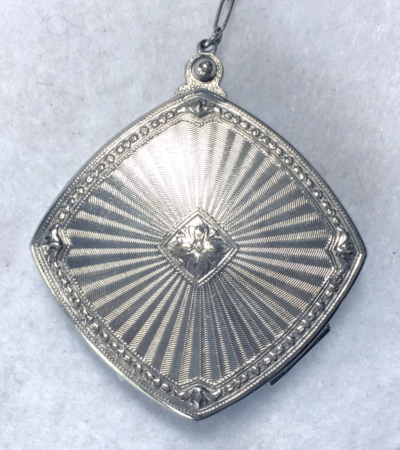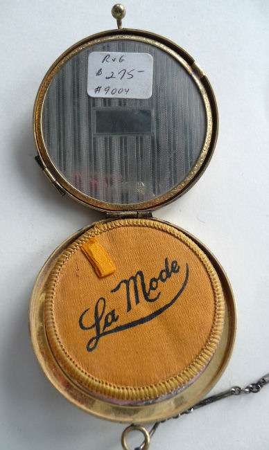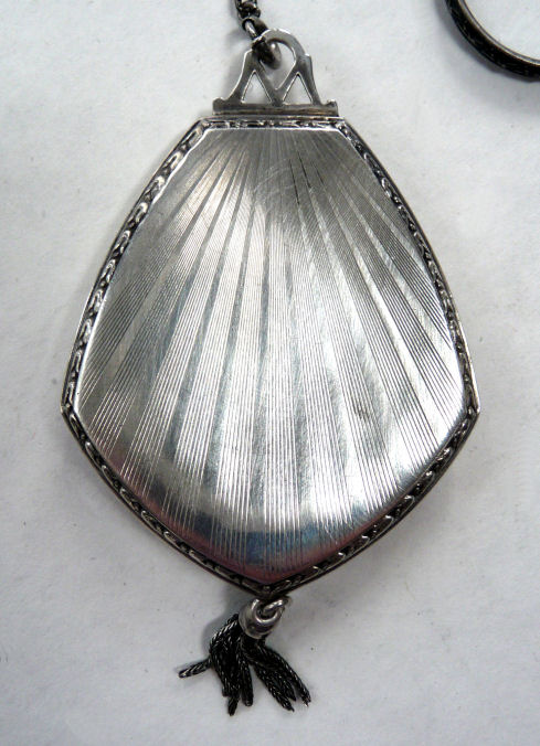 Here is a very elegant tango compact made by R & G Co. with a 14 Kt White Gold front by Belais. The Belais Manufacturing Co. was out of New York and was in business from 1876-1933. They were very early manufacturers of white gold in the U.S. The engraving on this case is spectacular and was so hard to photograph to its full effect. The swirls and curlicues are done in a high-gloss finish while the background is an engine-turned satin finish. I have tried to capture it in the pictures. On the center front is a little raised enamel vignette with a hand-painted pink flower on black background. The interior of the compact is divided into two portions ... the bottom half has a cover which swivels open to reveal a mirror on the back and a rouge pot inside. The top half of the compact has a powder pat. There are two gold puffs inside that match and the larger of the two says LaMode, so I am sure these are not original but are vintage and probably were bought somewhere along the line to replace worn ones. Overall in very good condition ... could use a minor cleaning here and there but I will leave that to you. The pictures make it look a lot worse than it is ... it is gorgeous in person! Measures 2-1/2" diameter and the chain and finger ring are 4-1/4" long total. (Click on pic for more photos.) |