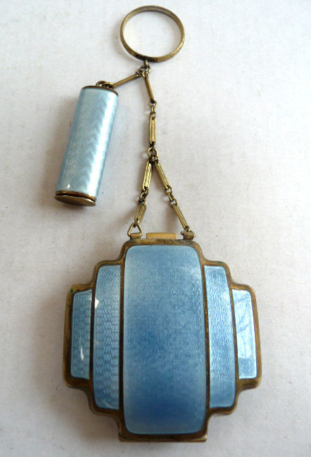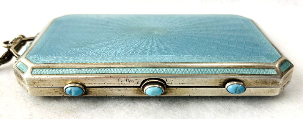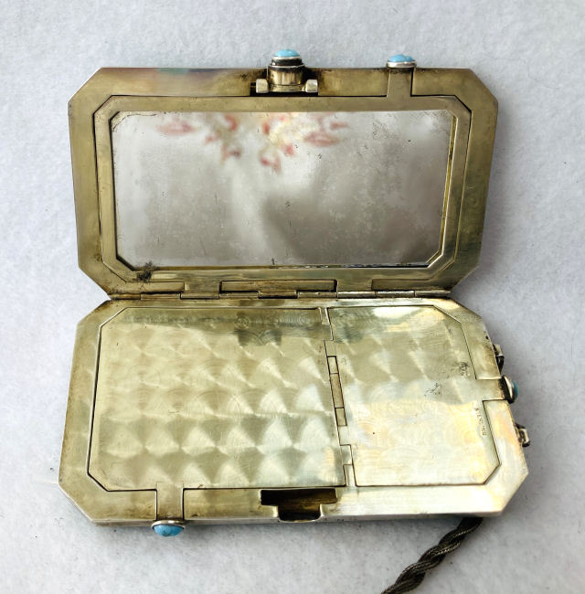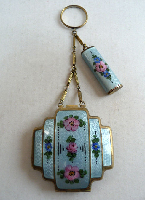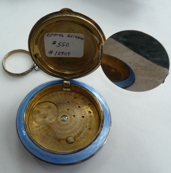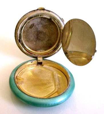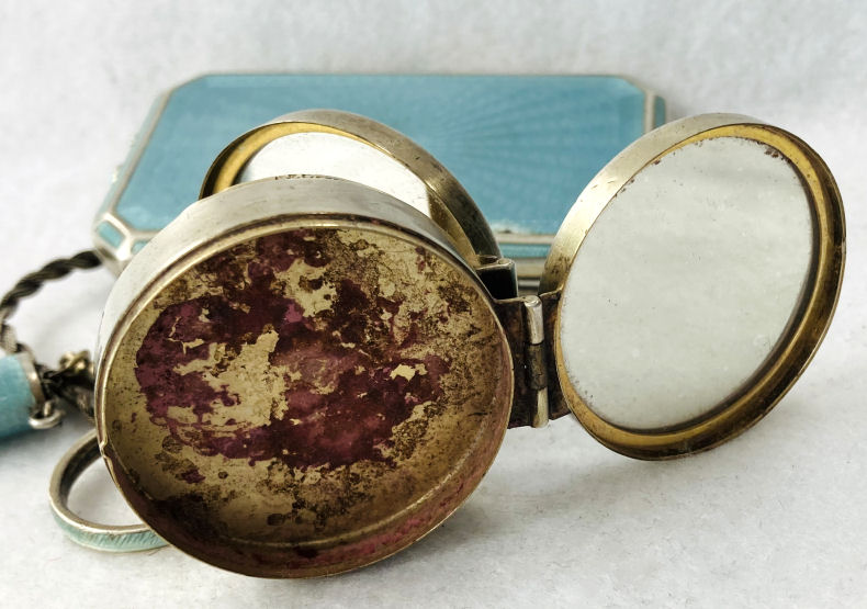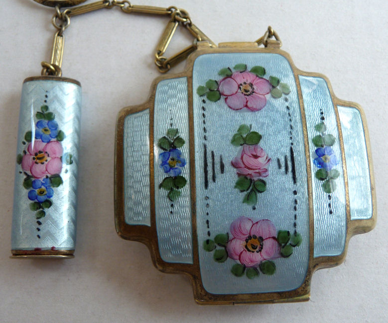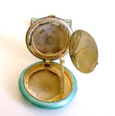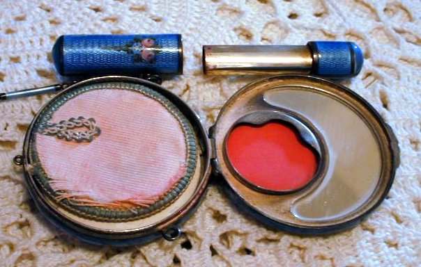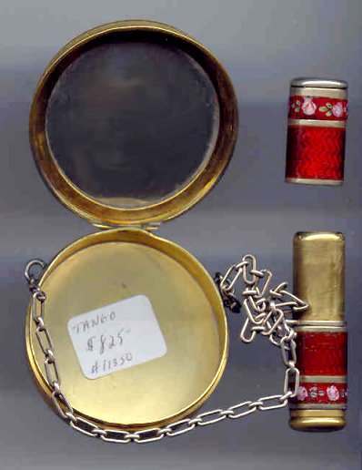 This is quite a pretty double enamel guilloche tango by an unknown maker with a blue vignette of a rose on the front surrounded by a gold gilt border and two blue flowers above and below. The back of the compact is a plain aqua enamel guilloche. The enameling covers the entire surface to the edges making it quite large. The lipstick case is unusual in that it has a removable lipstick inside. Also the enameling on the case is not guilloche but does have a blue flower on it. Inside the compact is a rotating powder sifter on one side and a flip-up metallic mirror with rouge pot and puff beneath. The enameling on the compact has surface scuffs and the lipstick case has a few miniscule flakes. The mirror inside has visible rust pitting on both sides ... priced below my cost because of these issues.... I had paid $400 for it 8 years ago. It is not marked sterling even though I was told it was when I bought it. Compact measures almost 2-1/4" diameter and lipstick case is a bit over 2" long. (Click on pic for more photos.) |