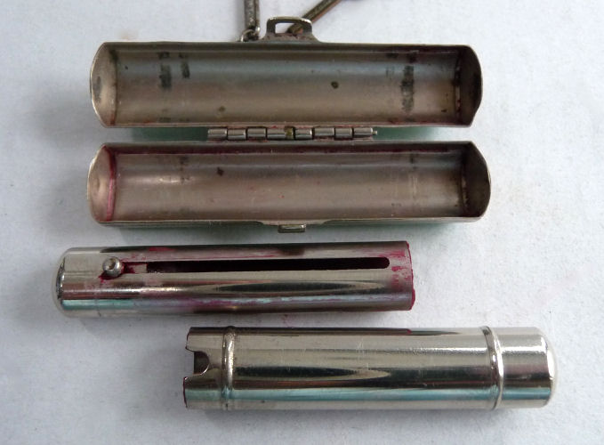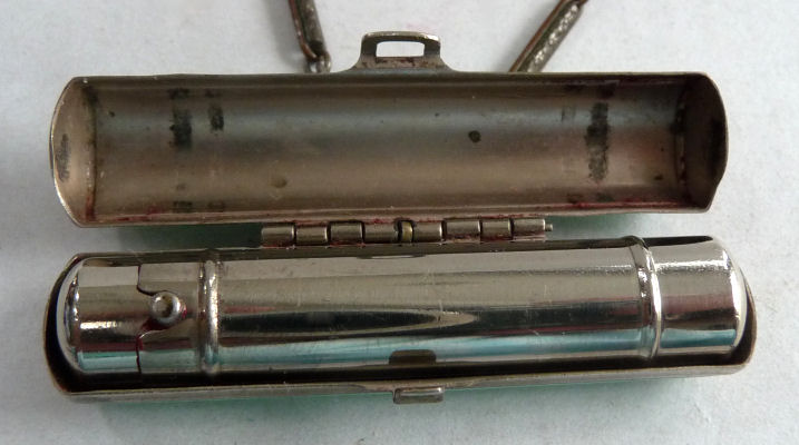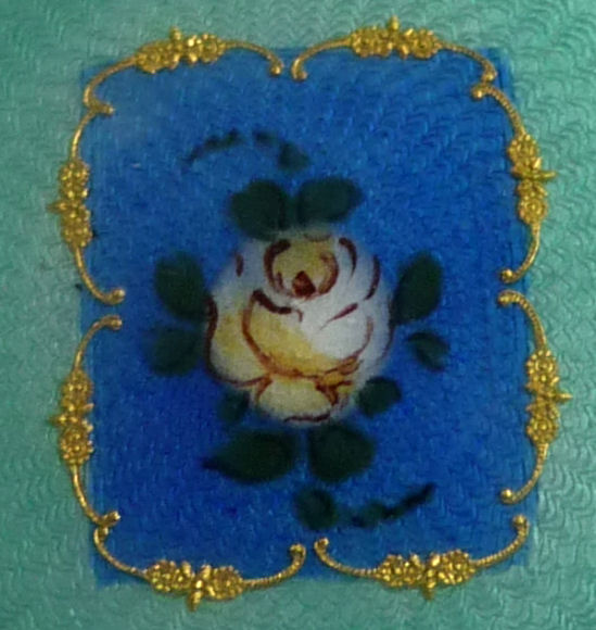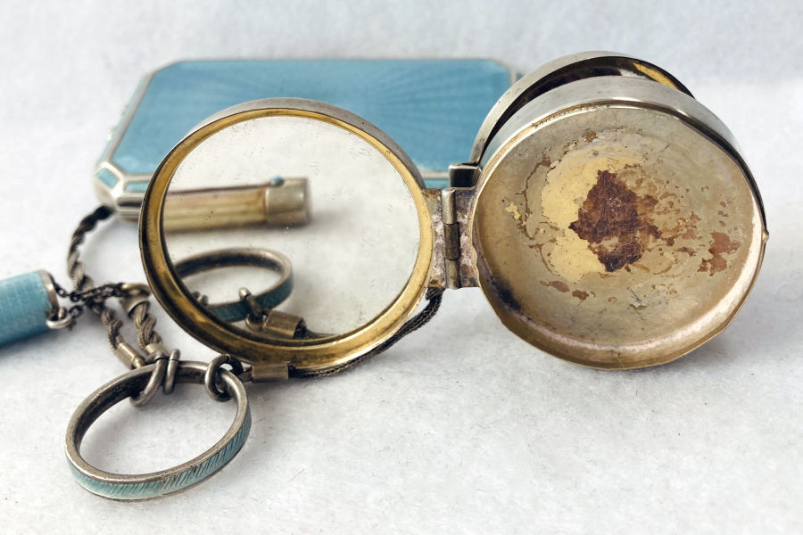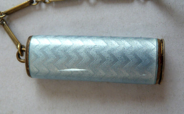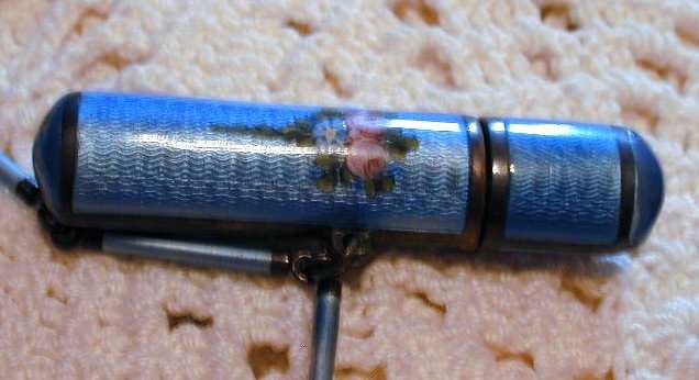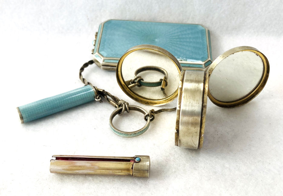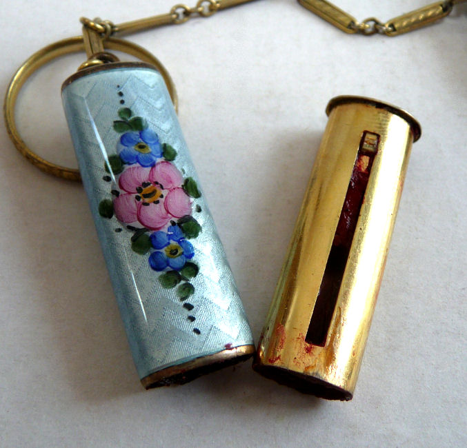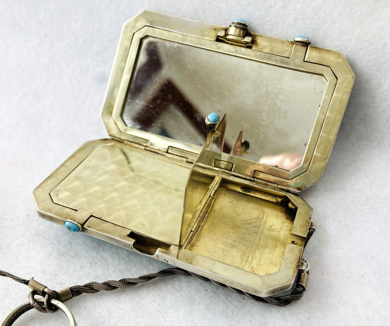 This is quite a pretty double enamel guilloche tango by an unknown maker with a blue vignette of a rose on the front surrounded by a gold gilt border and two blue flowers above and below. The back of the compact is a plain aqua enamel guilloche. The enameling covers the entire surface to the edges making it quite large. The lipstick case is unusual in that it has a removable lipstick inside. Also the enameling on the case is not guilloche but does have a blue flower on it. Inside the compact is a rotating powder sifter on one side and a flip-up metallic mirror with rouge pot and puff beneath. The enameling on the compact has surface scuffs and the lipstick case has a few miniscule flakes. The mirror inside has visible rust pitting on both sides ... priced below my cost because of these issues.... I had paid $400 for it 8 years ago. It is not marked sterling even though I was told it was when I bought it. Compact measures almost 2-1/4" diameter and lipstick case is a bit over 2" long. (Click on pic for more photos.) |