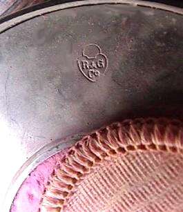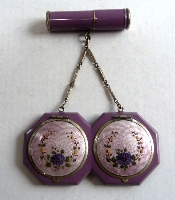 Here we have a fabulous tango compact and lipstick set made by R & G Co. This outstanding piece features a finger ring with removable chain (with one lavender enameled link in the chain) and a large size compact on one end with matching double eyebrow and lipstick on the other. The lavender enamel guilloche is embellished with hand-painted roses on both pieces. The interior of the compact features an empty powder well in the base and a swing-out mirror in the lid with a rouge pot and original puff beneath. The double eyebrow/lipstick is marked accordingly on each end which is which. Marked Sterling on the lipstick case, this wonderful item is in very good condition with no chips or cracks to the enameling at all. The only thing that would merit mentioning are two very faint areas near the edge that have some slight discoloration (right under clasp and at about 8:30). Compact measures 2-1/2" diameter. (Click on pic for more photos.) |